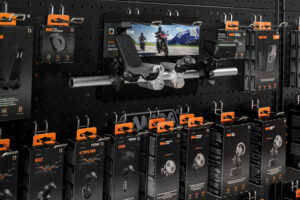 Display da gancio, manubrio con riser per esposizione prodotti moto