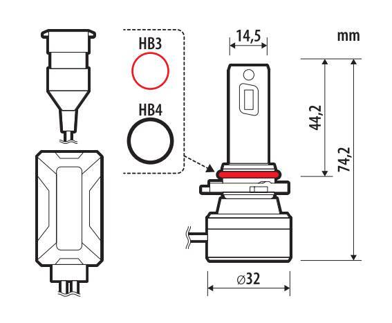| Dati Extra | Volt: 12/24V Lampada: (HB3-HB4) Watt: 55W Ventola: Yes Centralina: OUT Attacco: P20d / P22d Temperatura Colore: 6.500° K Lumen (Freddo): 5530 lm Lumen (Caldo): 4220 lm |