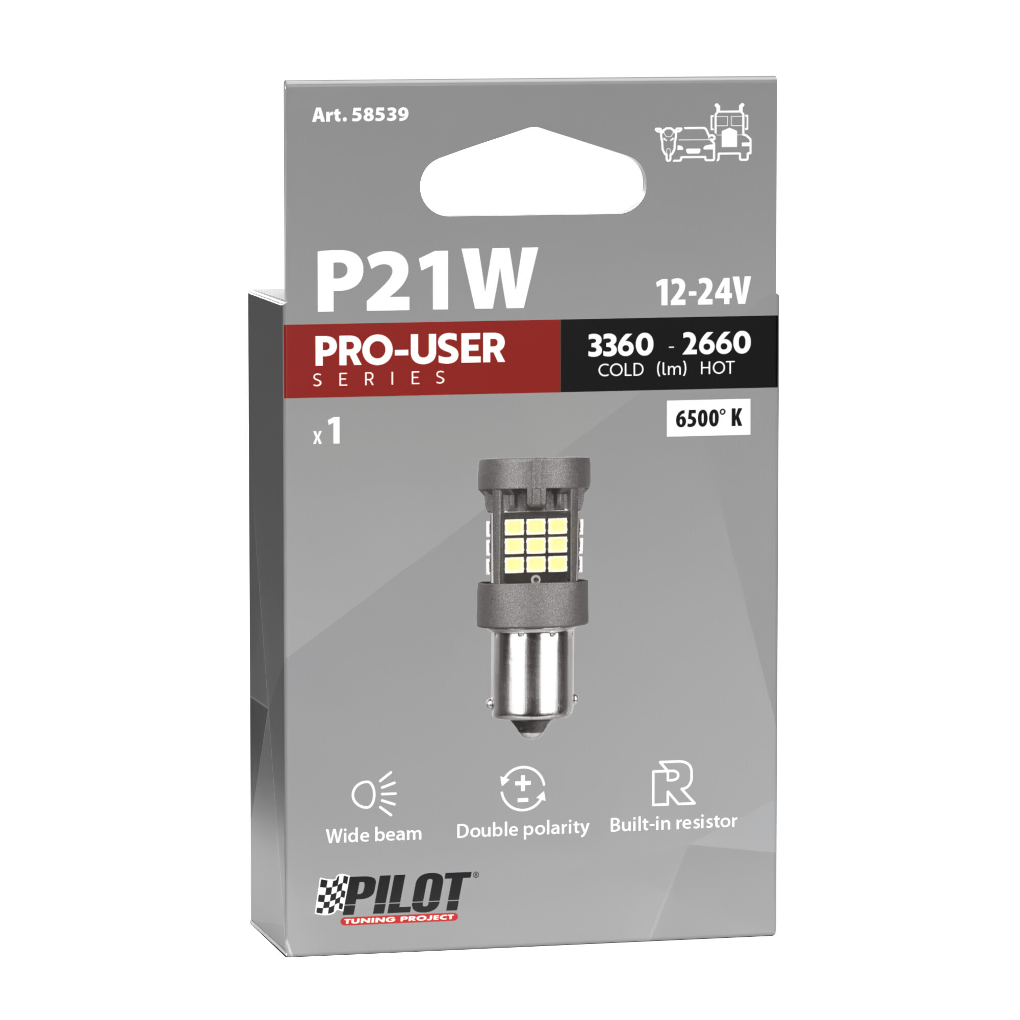 12/24V Pro-User Series – (P21W) – BA15s – 1 pz – Scatola – Bianco – Doppia polarità – Resistenza incorporata