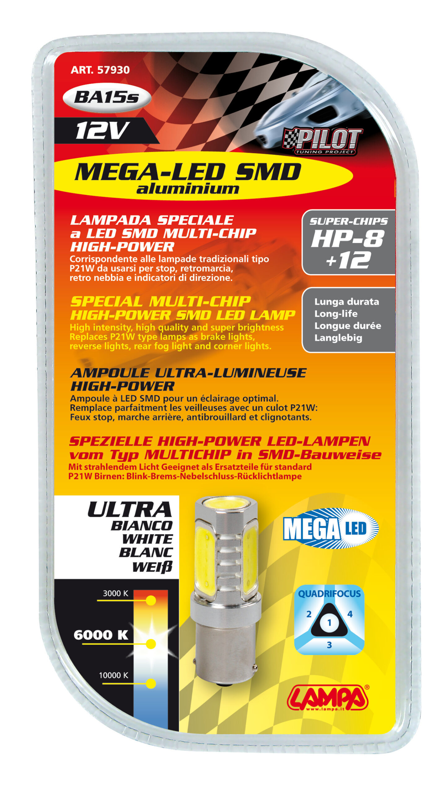 12V Led Series – 8 super chips + 12 chips – (P21W) – Quadrifocus – BA15s – 1 pz – D/Blister – Bianco