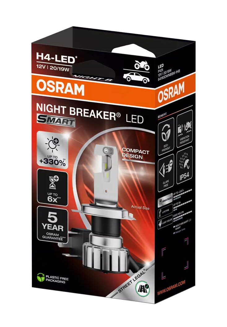 Con le NIGHT BREAKER LED SMART, omologate per la circolazione stradale, il loro innovativo design compatto, la costruzione sofisticata e l’eccezionale luminosità, è ora possibile passare dalle tradizionali lampade alogene alla tecnologia LED OSRAM in un numero ancora maggiore di veicoli.