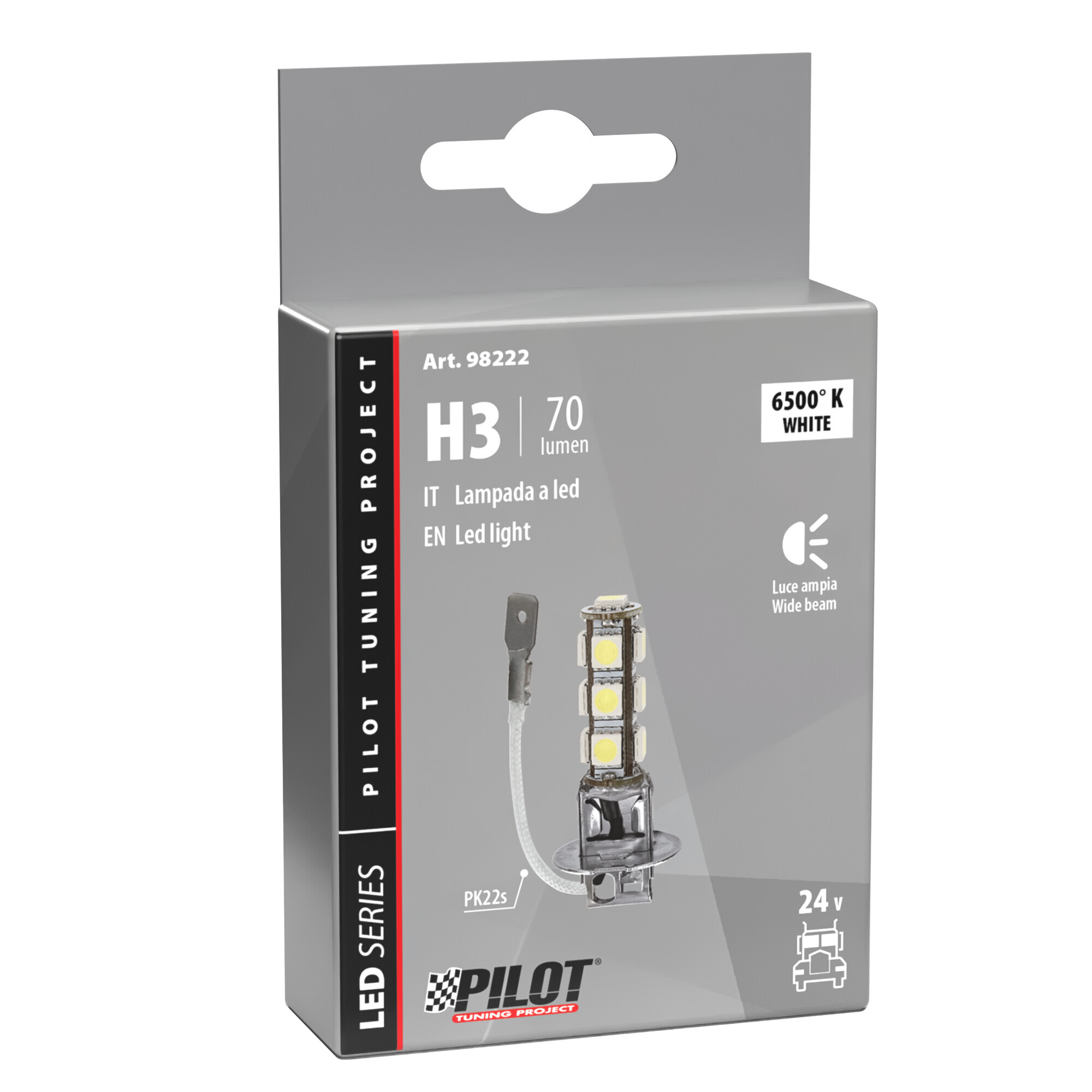 | Dati Extra | Volt: 24/28V Lampada: (H3) Attacco: PK22s Temperatura Colore: 6500K Disegno: L089 Lumen (Freddo): 70 lm Led: Smd |