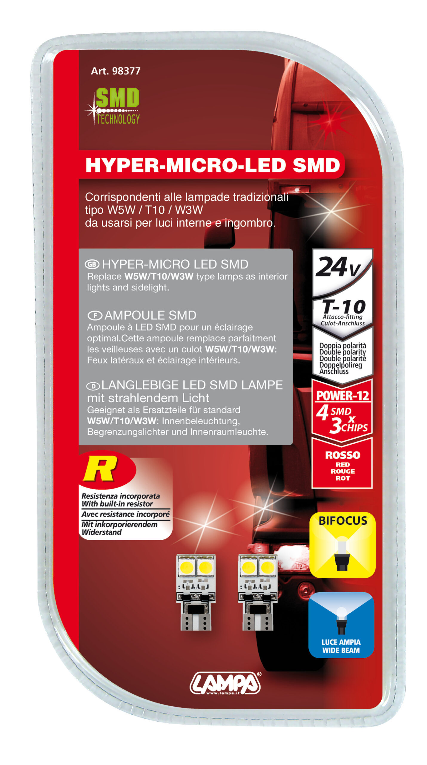 24V Hyper-Led 12 – 4 SMD x 3 chips – (T10) – Bifocus – W2,1×9,5d – 2 pz – D/Blister – Rosso – Doppia polarità – Resistenza incorporata