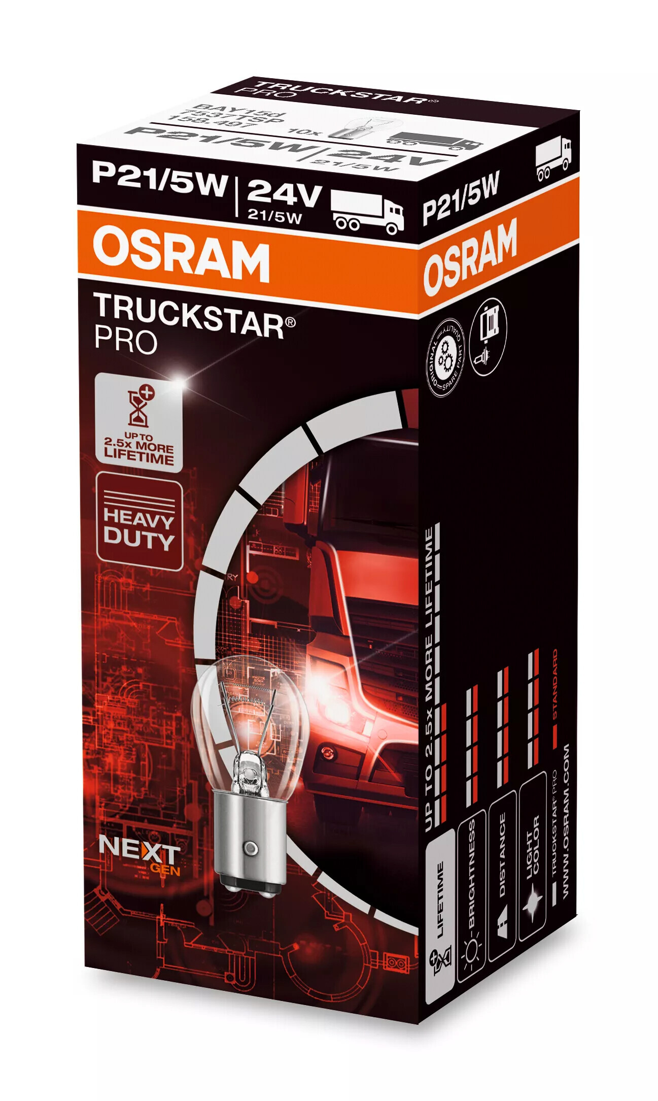 Le lampade OSRAM TRUCKSTAR® PRO si distinguono dalle lampade tradizionali 24V per la tecnologia brevettata a filamento singolo. Questa tecnologia proietta il 100% di luce in più sulla strada, favorendo la concentrazione dei conducenti, con grandi vantaggi in termini di sicurezza stradale. Il fascio luminoso uniforme e fino a 40 m più lungo permette di vedere i pericoli molto prima, con un tempo di reazione molto più lungo. OSRAM TRUCKSTAR® PRO è progettata per resistere alle forti vibrazioni e garantisce il risparmio di tempo e denaro grazie a prestazioni e durata più che doppia.
