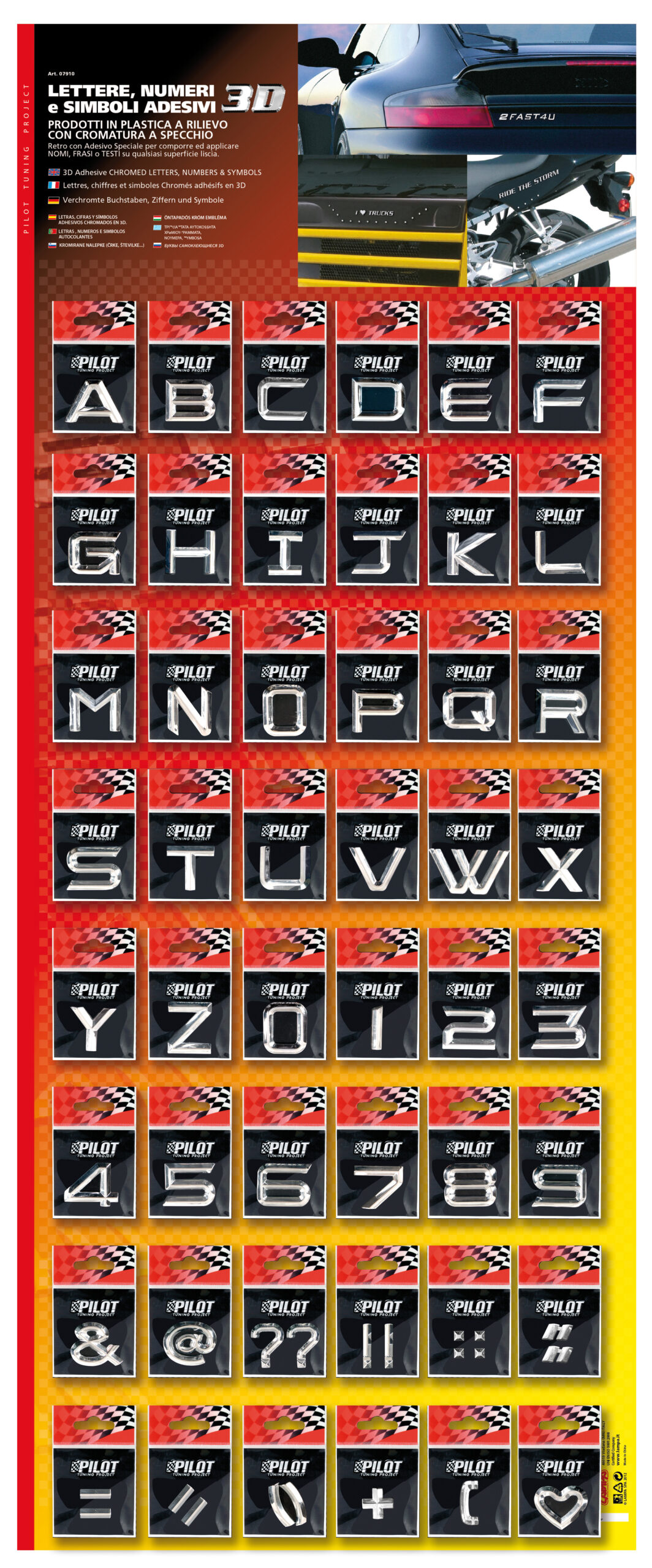 Lettere, numeri e simboli adesivi. In plastica a rilievo con cromatura a specchio. Retro con adesivo speciale. 48 caratteri assortiti per 10 pezzi