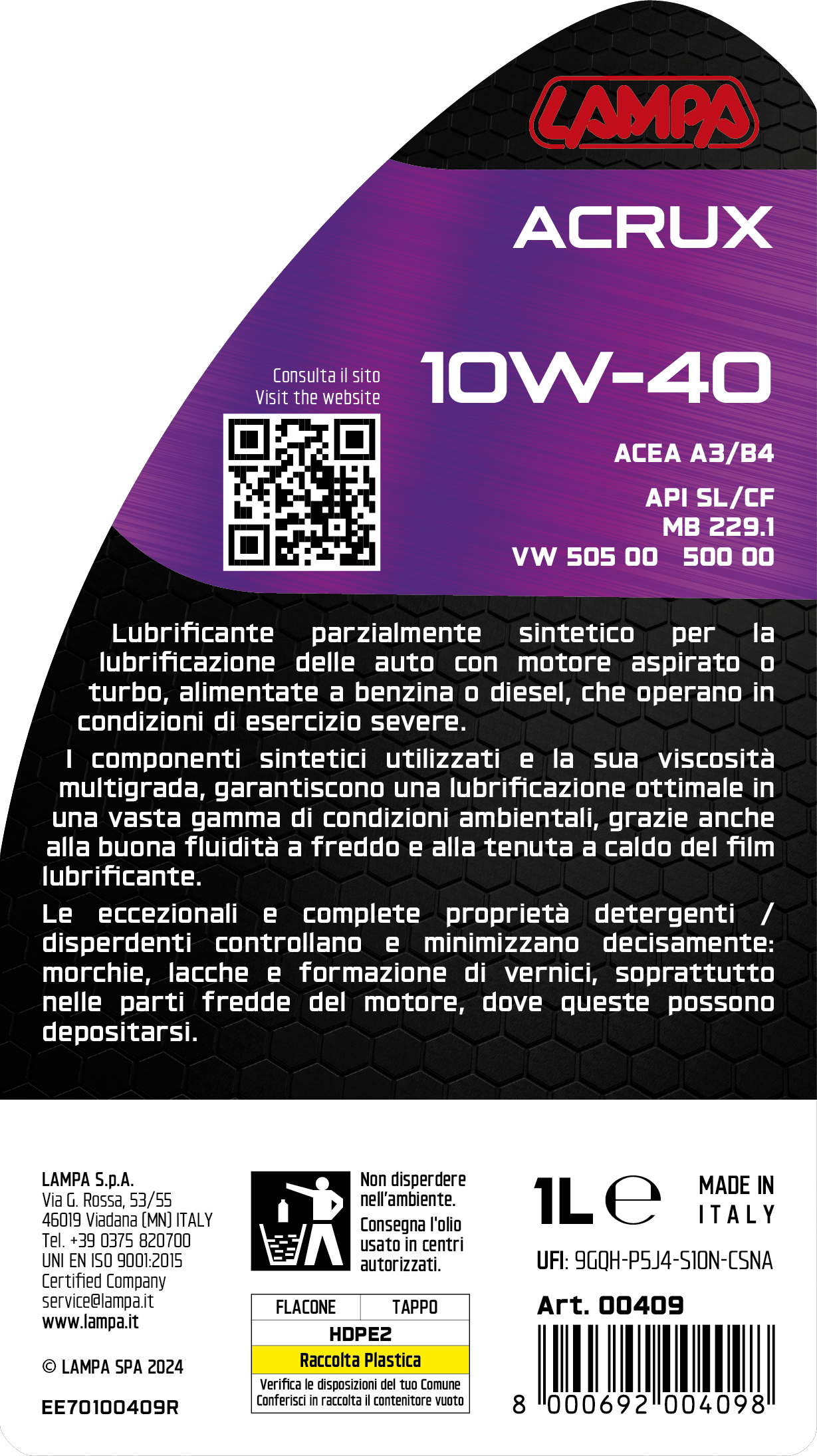 I componenti sintetici utilizzati e la sua viscosità multigrada, garantiscono una lubrificazione ottimale in una vasta gamma di condizioni ambientali, grazie anche alla buona fluidità a freddo e alla tenuta a caldo del film lubrificante.
