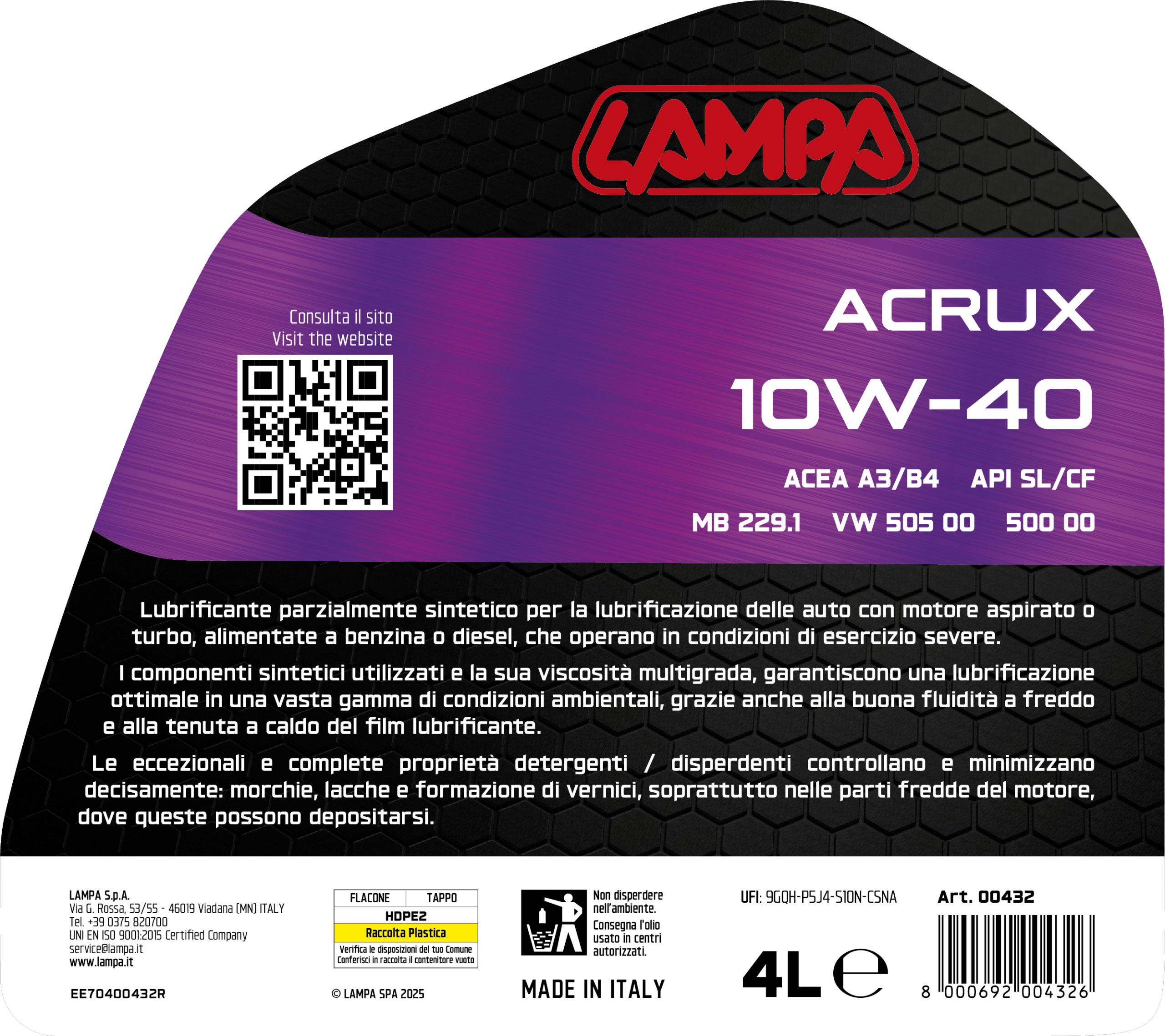 I componenti sintetici utilizzati e la sua viscosità multigrada, garantiscono una lubrificazione ottimale in una vasta gamma di condizioni ambientali, grazie anche alla buona fluidità a freddo e alla tenuta a caldo del film lubrificante.