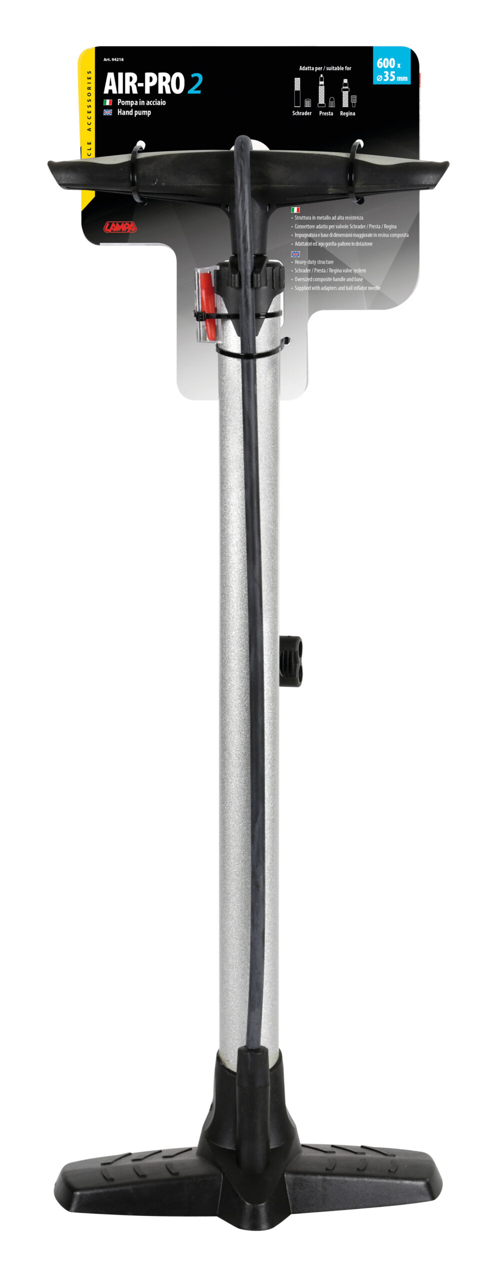 Struttura in metallo ad alta resistenza. Connettore per valvole Schrader, Presta, Regina, Dunlop. Impugnatura e base di dimensioni maggiorate in resina composita. Adattatori ed ago gonfia pallone in dotazione