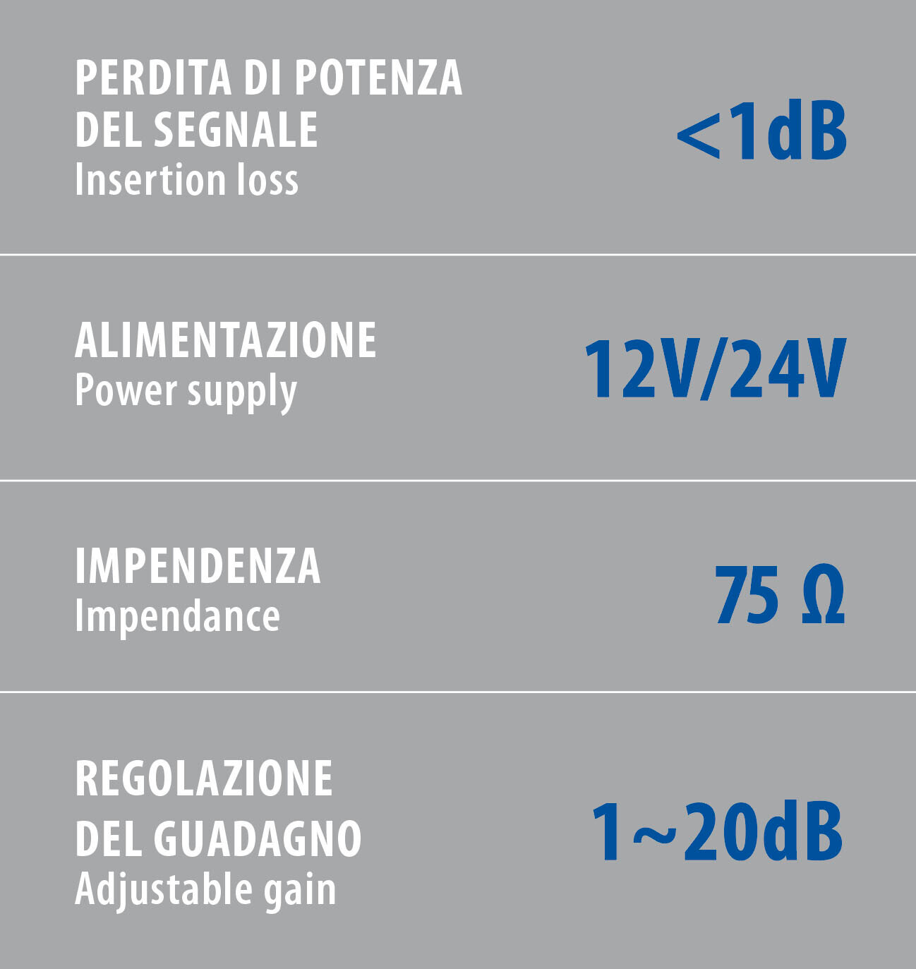 Con regolazione del guadagno. Alimentazione tramite spinotto accendisigari con cavo da 1,3 m. Viti per il montaggio incluse