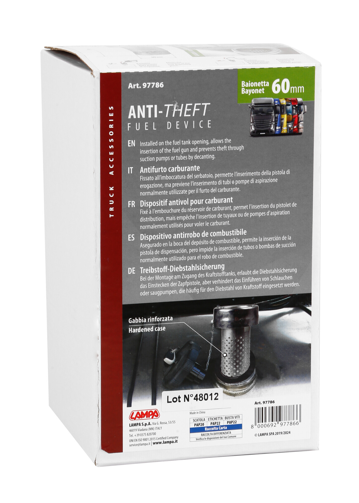 Fissato all’imboccatura del serbatoio carburante, permette l’inserimento della pistola di erogazione, ma previene l’inserimento di tubi o pompe di aspirazione normalmente utilizzate per il furto del carburante