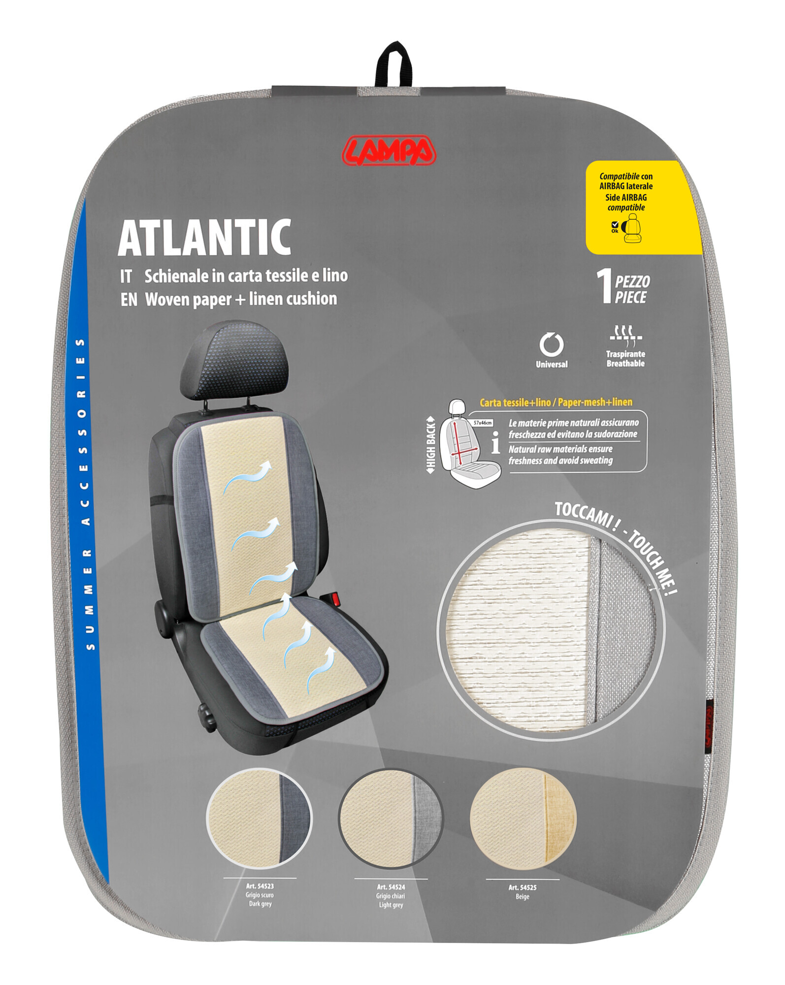 La combinazione del lino naturale e della carta tessile assicura una continua ventilazione tra corpo e sedile.