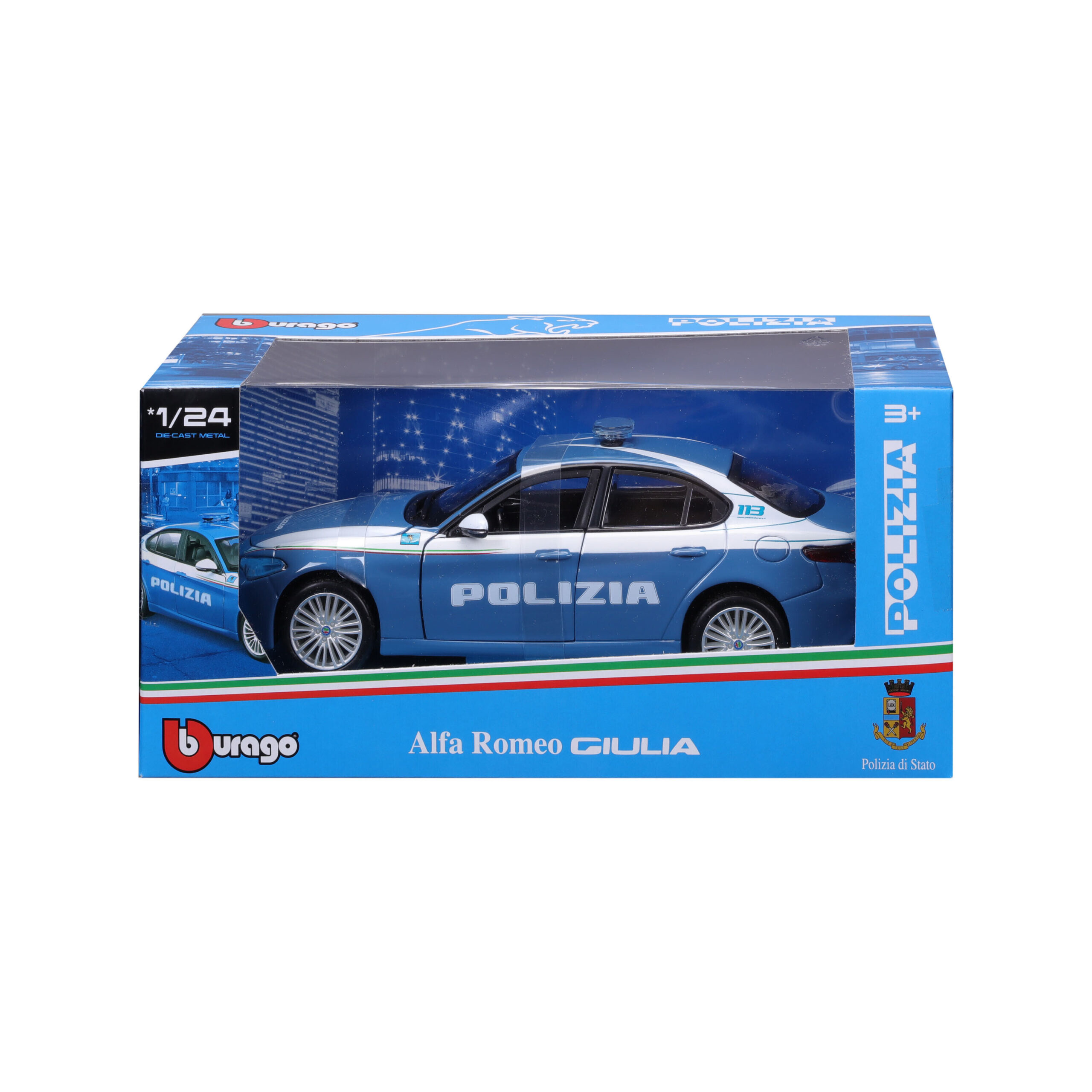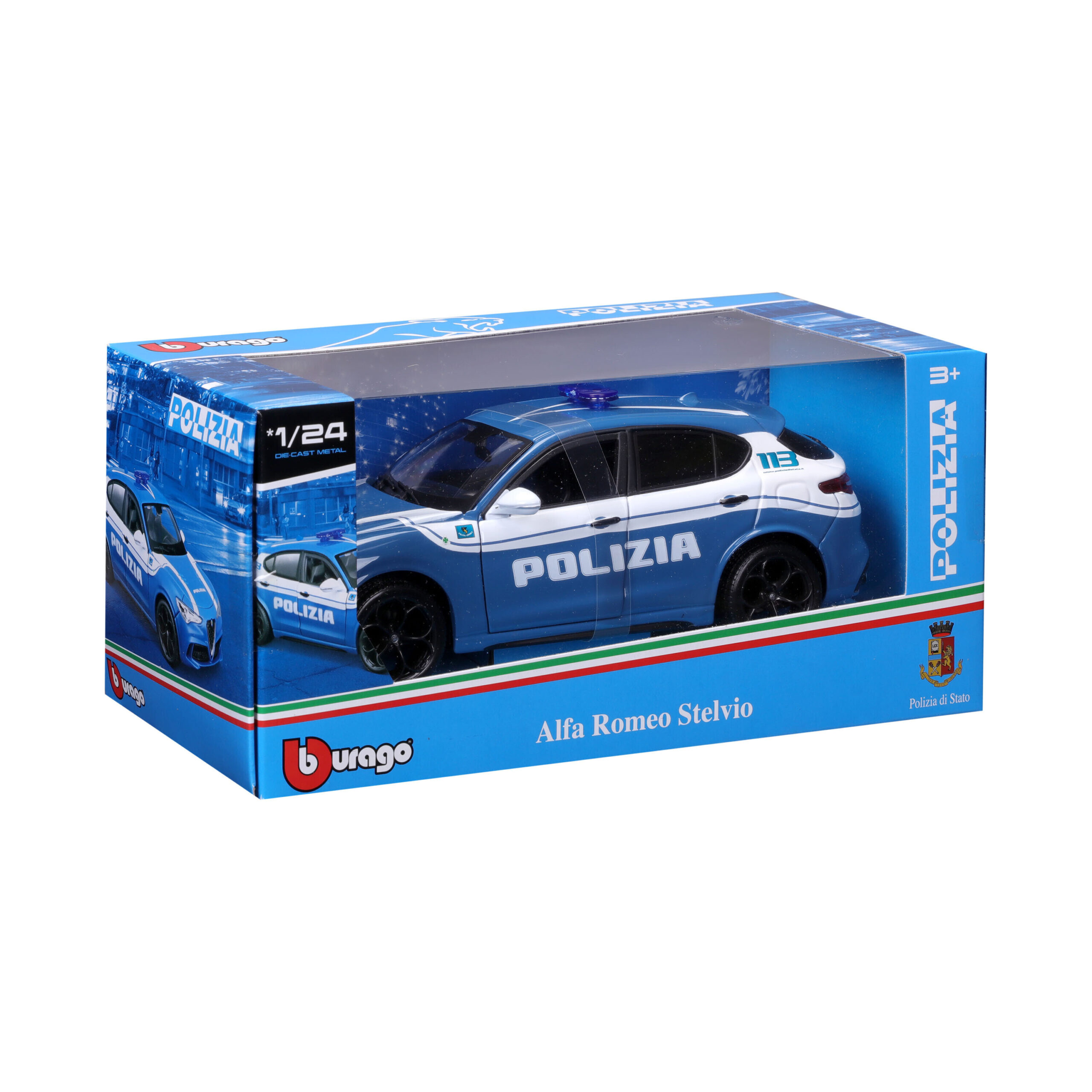 Auto Polizia, Alfa Romeo Giulia / Stelvio assortite, Burago, scala 1:24, scatola vetrina