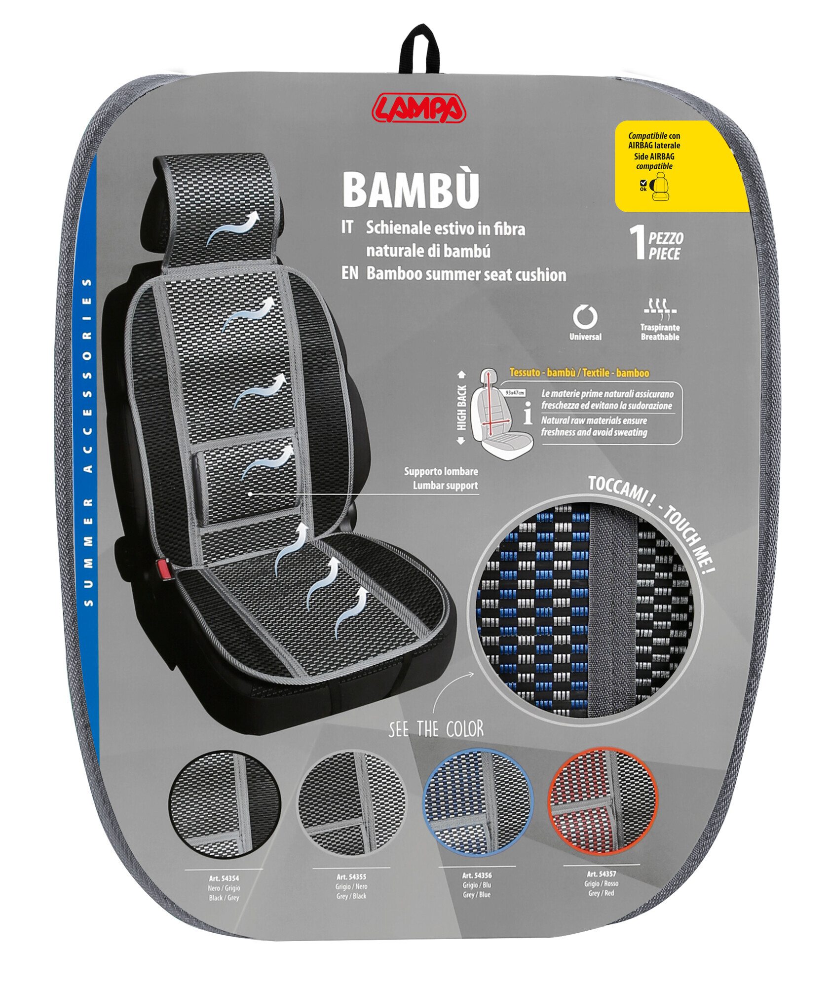 Universale. Con supporto lombare. In estate, anche se il veicolo è climatizzato, le parti a contatto con il sedile rimangono sempre umide o sudate. Lo schienale in bambù permette di viaggiare anche senza aria condizionata evitando di sudare a contatto con i rivestimenti sintetici dei sedili