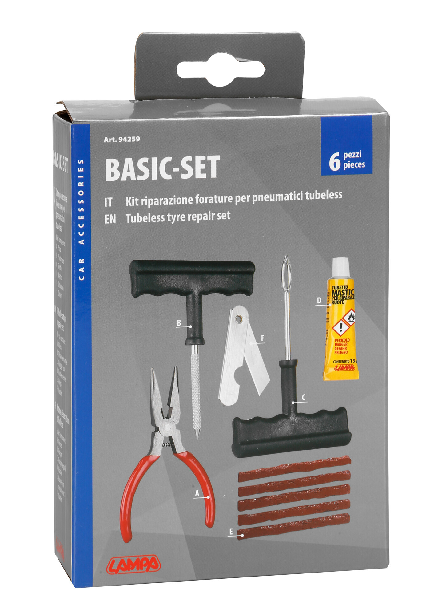 Il kit comprende: 1 pinza, 1 punteruolo per pulire ed allargare il foro da riparare, 1 sonda inserimento otturatore, 1 tubetto di mastice da 13 g, 5 otturatori, 1 cutter