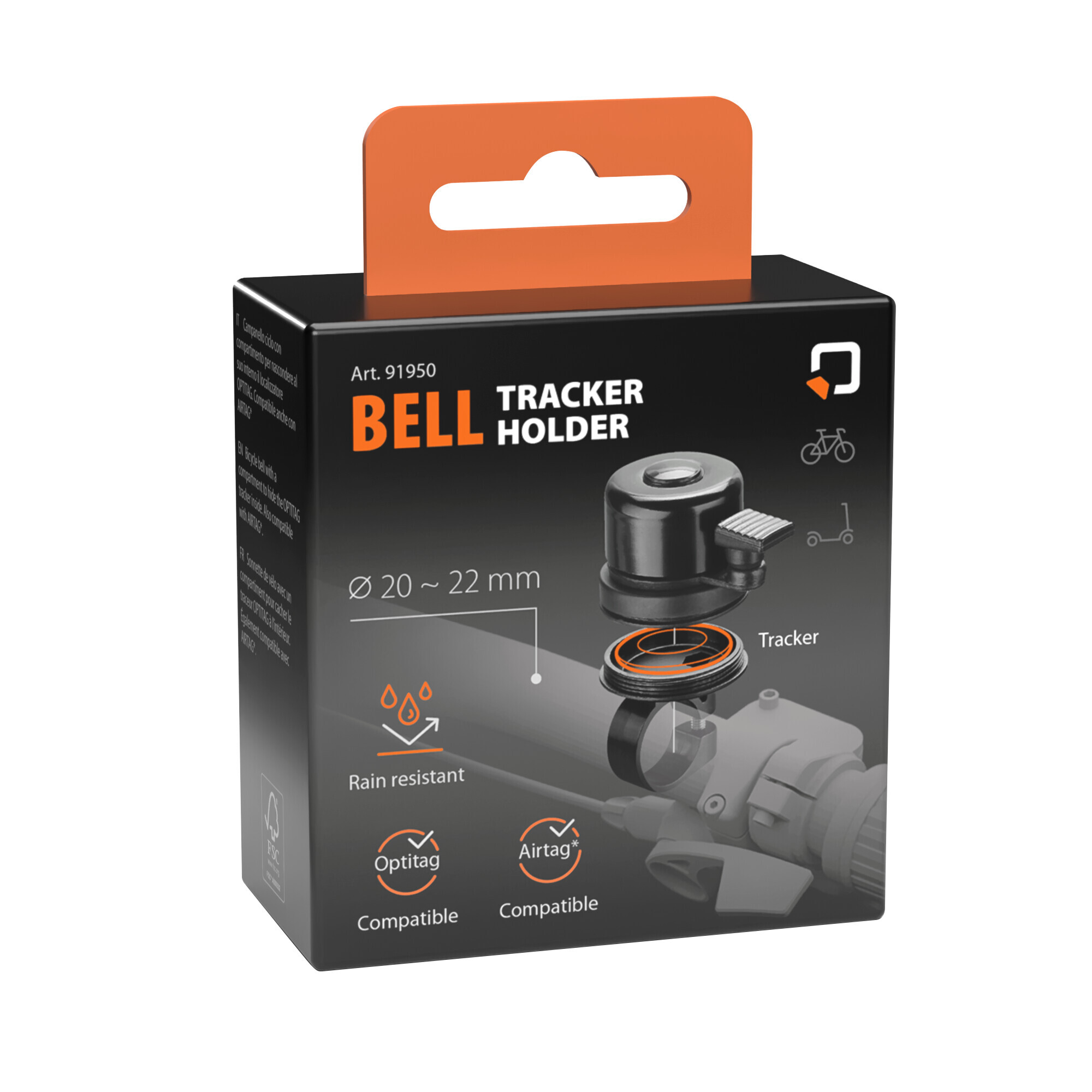 Campanello ciclo con compartimento per nascondere al suo interno il localizzatore Optitag. Compatibile anche con Airtag. Resistente alla pioggia. Per manubri Ø 20-22 mm