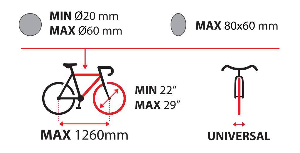 Per biciclette con telai a sezione circolare (20-60 mm) e ovoidale (max 80×60 mm).