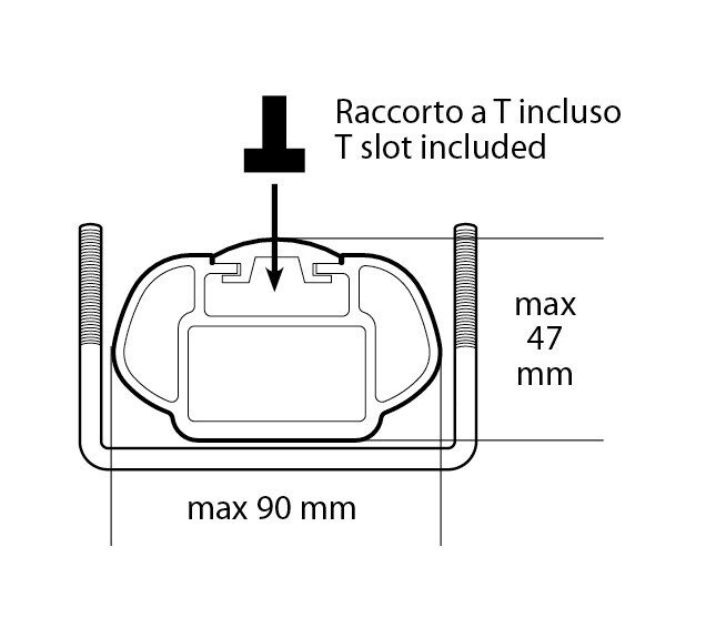 In dotazione: attacchi per barre portatutto con sezione max 47×90 mm e raccordi per barre con profilo a “T”