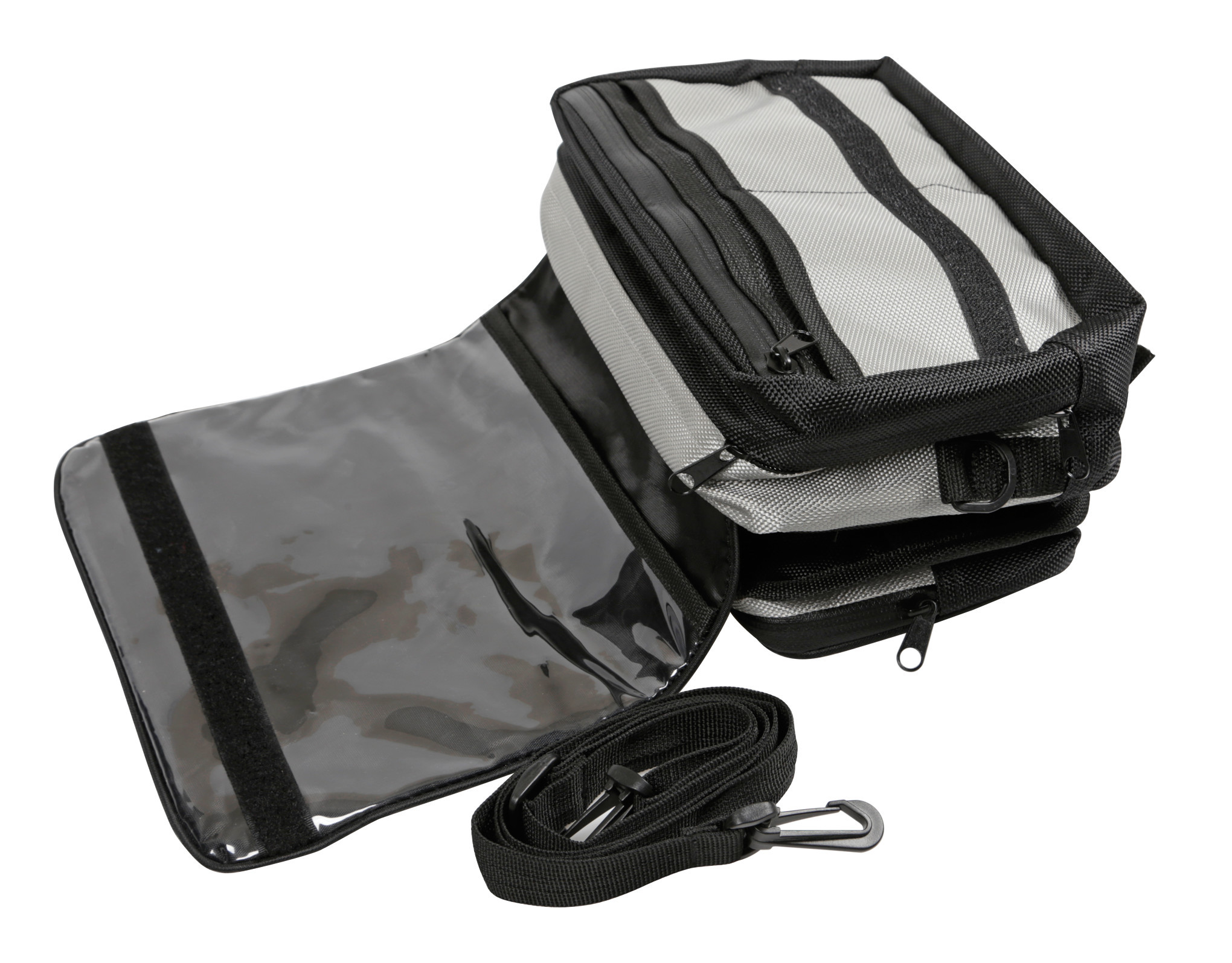 Impermeabile. Fibbie per il fissaggio al manubrio. Inserto riflettente. Con tracolla e maniglia. 7 scomparti + 1 tasca trasparente porta-cartina. Cuciture rinforzate. Zip impermeabile. In poliestere 1680D accoppiato con PVC