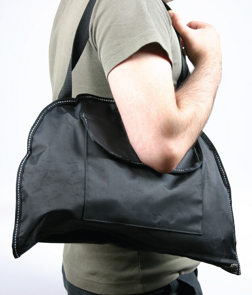 La pettorina diventa una pratica borsa. Cinghie regolabili per collo e vita.