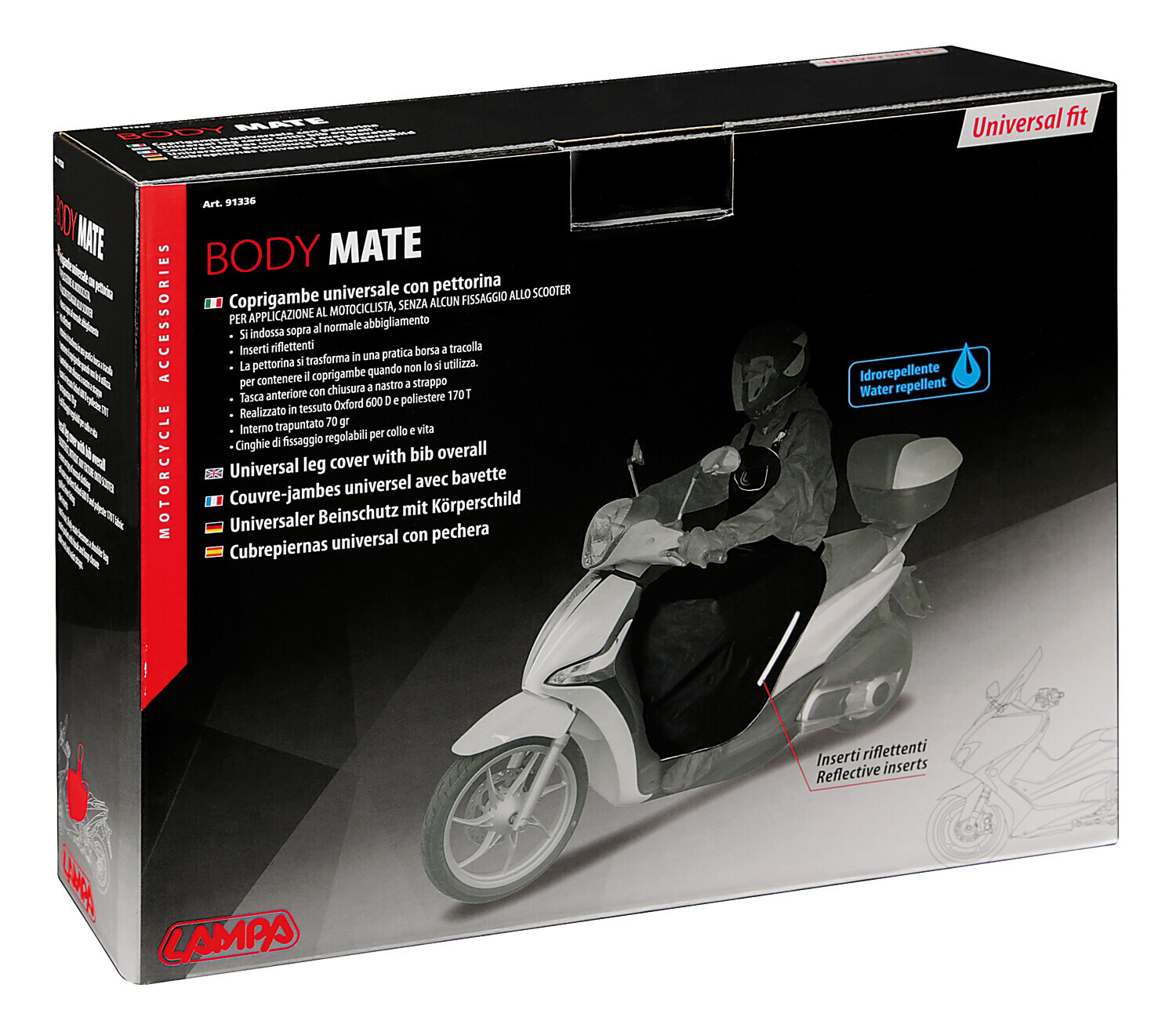 Senza alcun fissaggio allo scooter. In cordura idrorepellente con interno trapuntato e inserti riflettenti, tasca anteriore con chiusura a velcro.