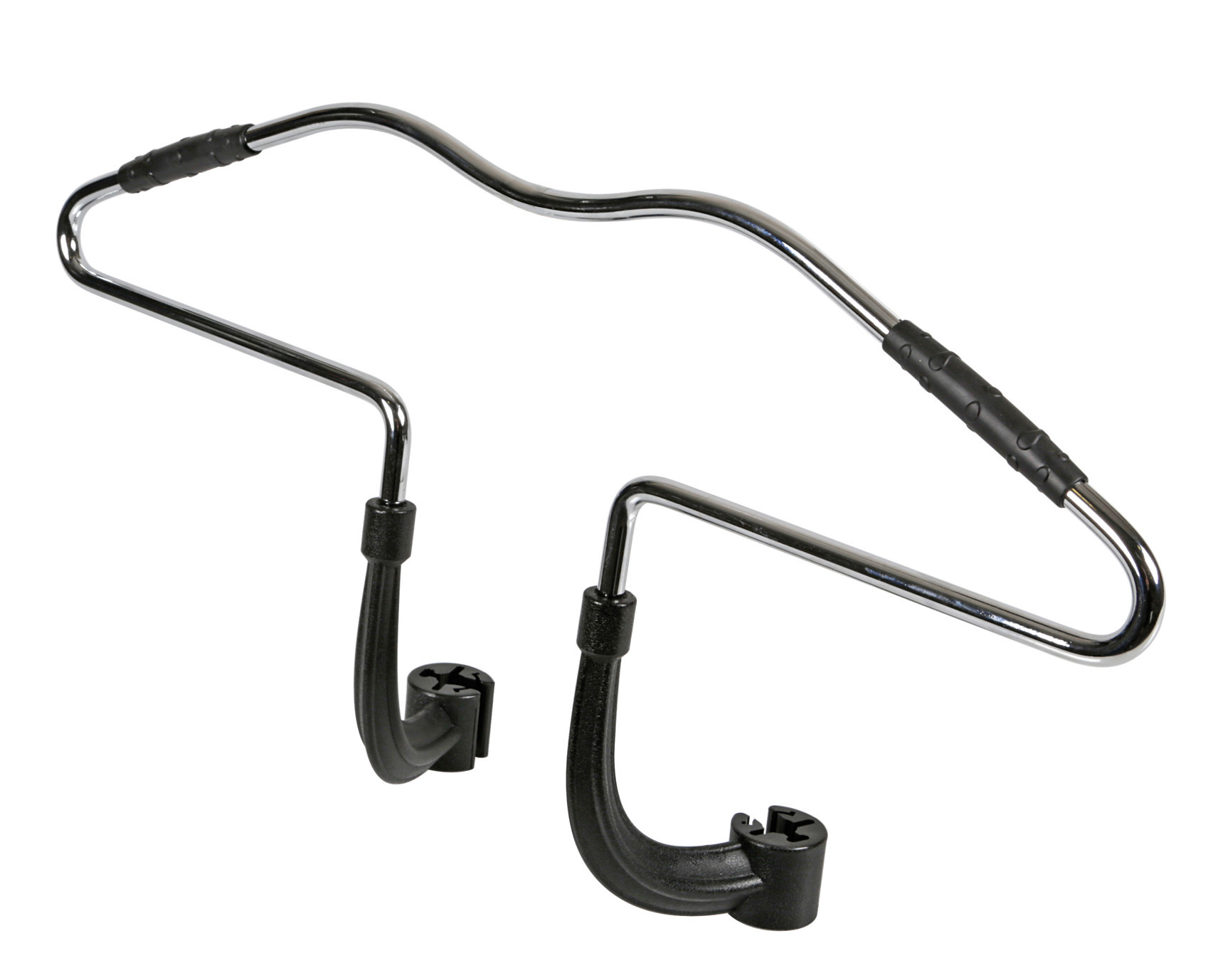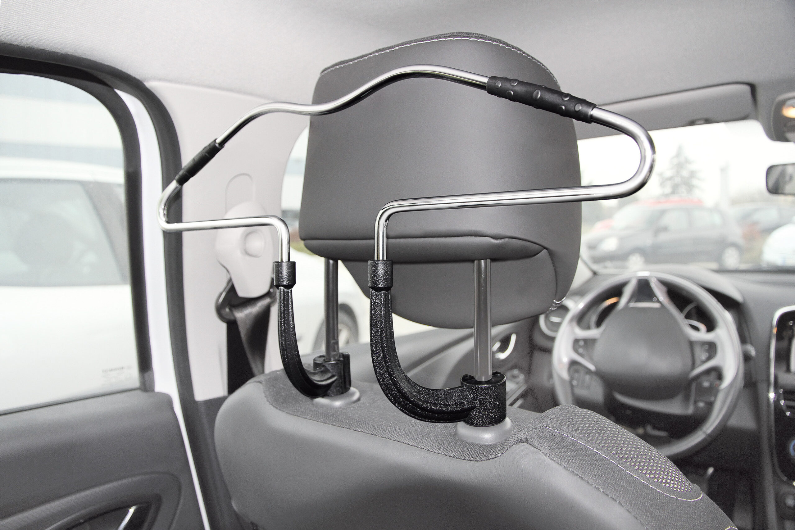 Appendiabiti in metallo cromato con fissaggio alle aste poggiatesta (da 8 a 13 mm Ø). Rivestimento antiscivolo.
