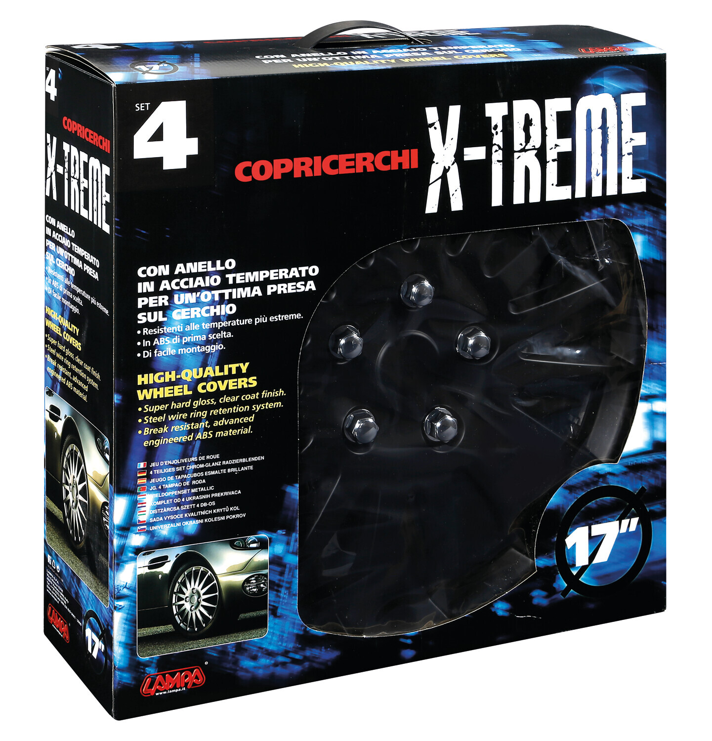 Set 4 copricerchi qualità “X-Treme” in ABS. Bulloni cromati. Anello in acciaio temperato. Di facile montaggio