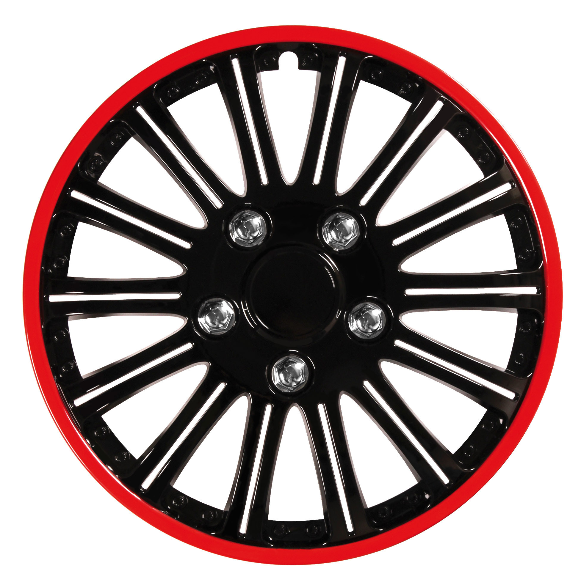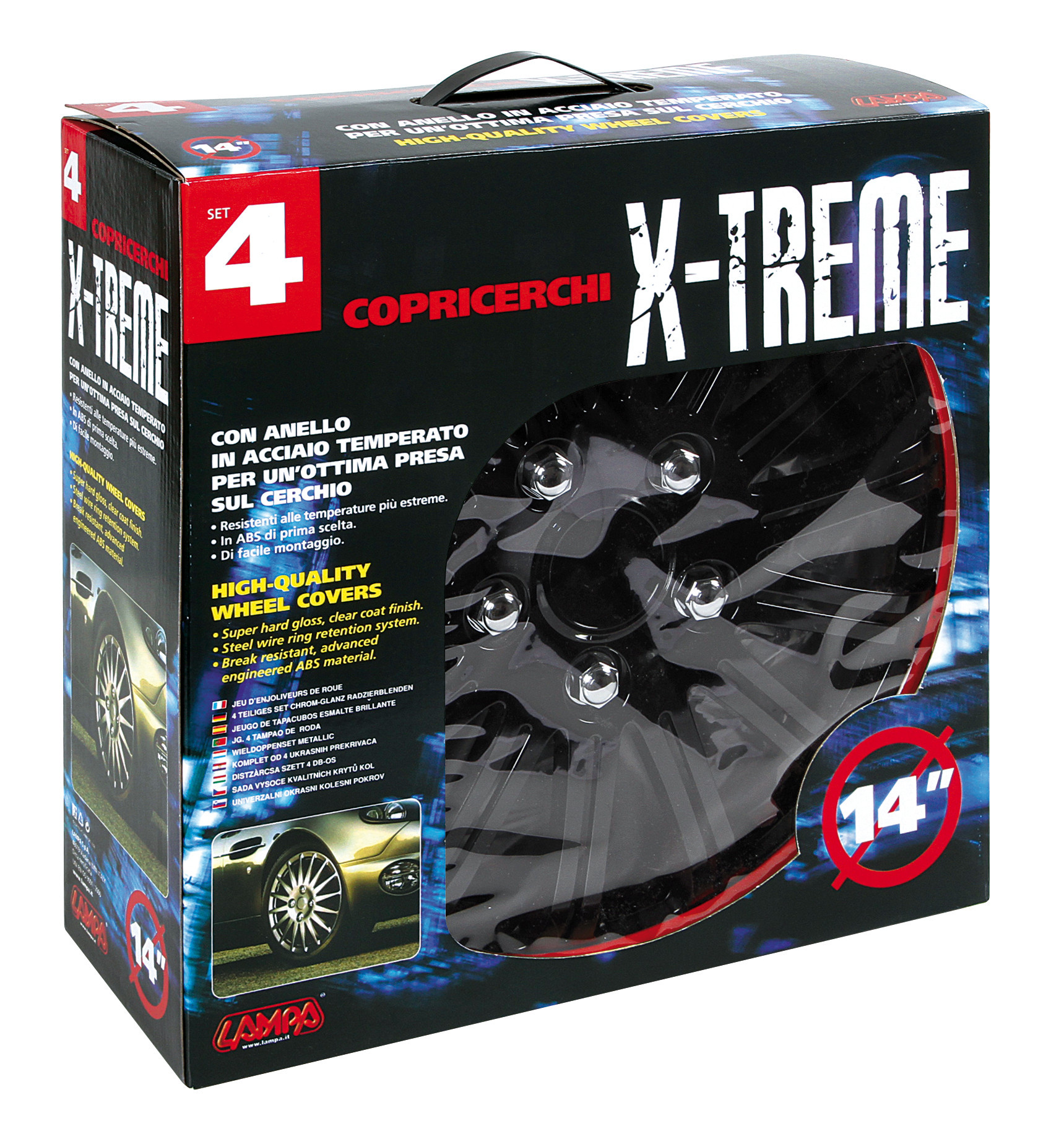 Set 4 copricerchi qualità “X-Treme” in ABS. Verniciatura bicolore con finitura lucida e bulloni cromati. Anello in acciaio temperato. Di facile montaggio