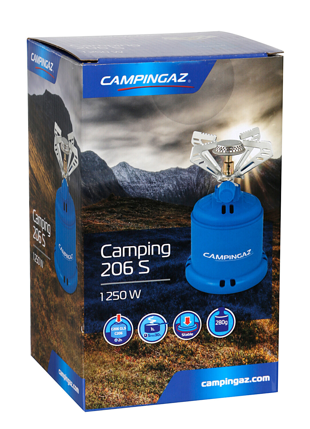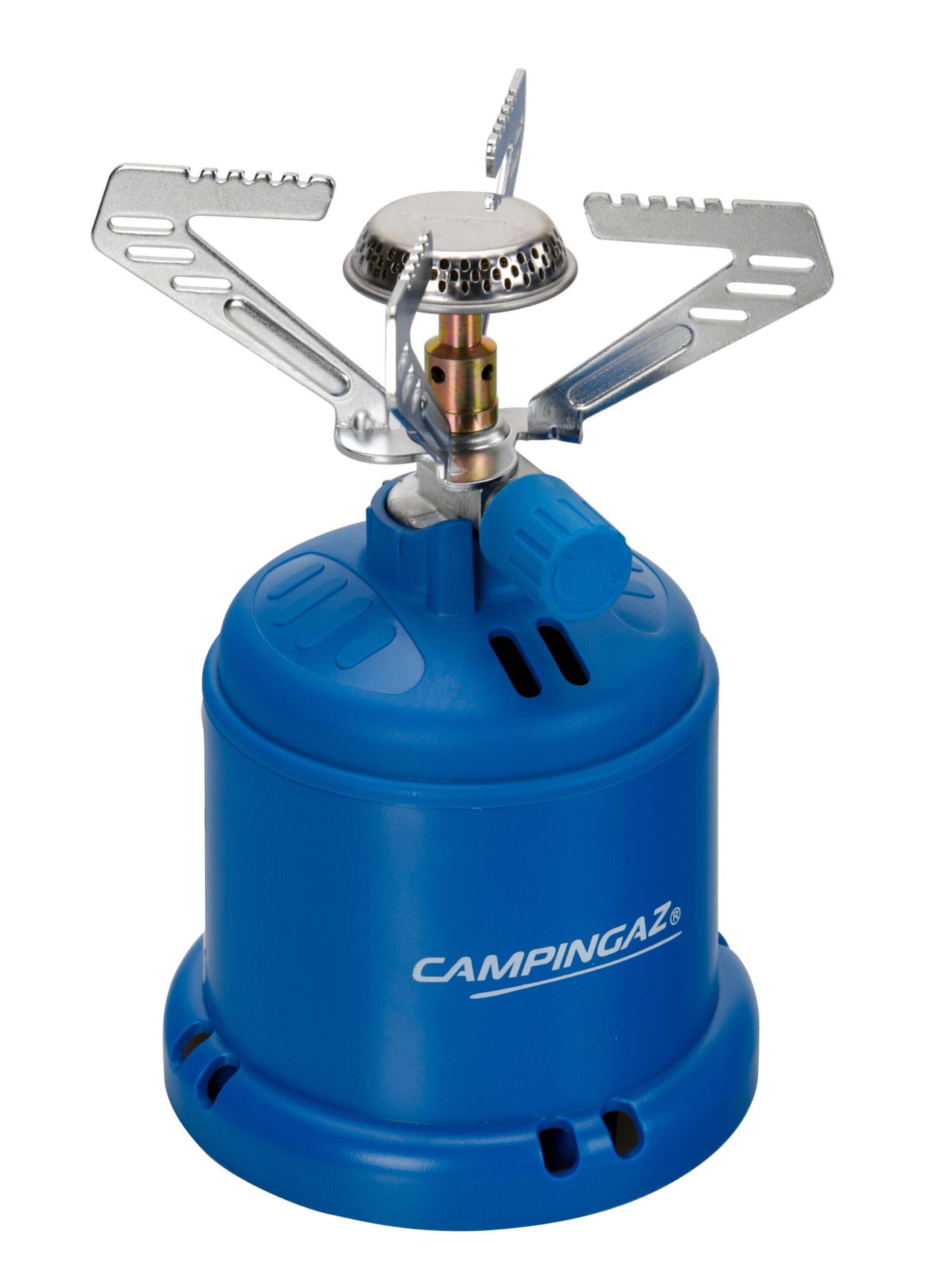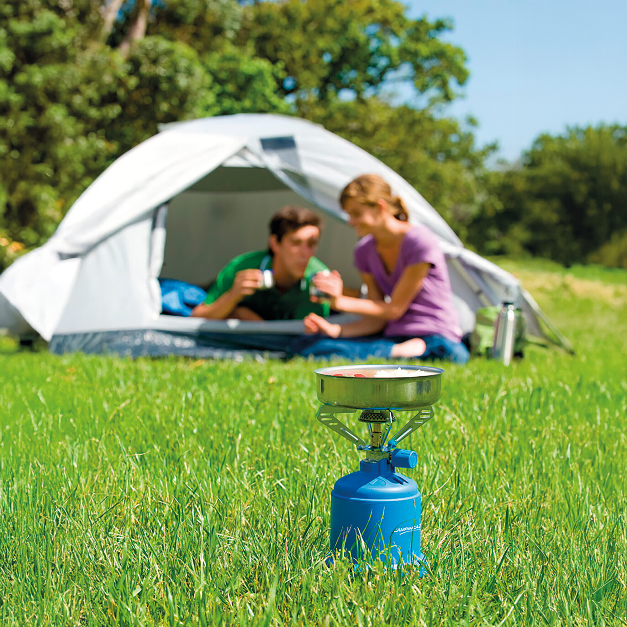 • Classico fornello da campeggio con cartuccia forabile e accensione manuale.