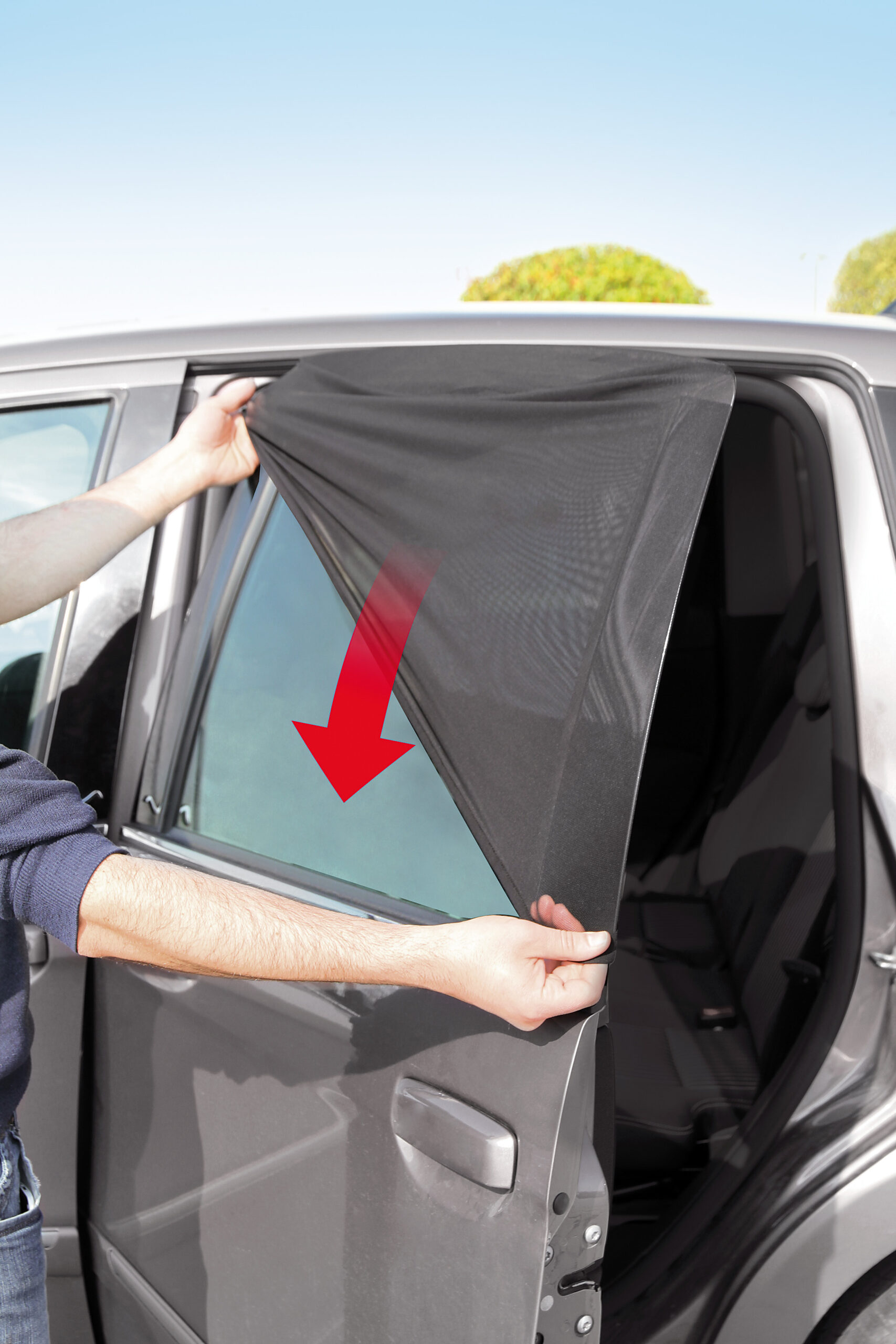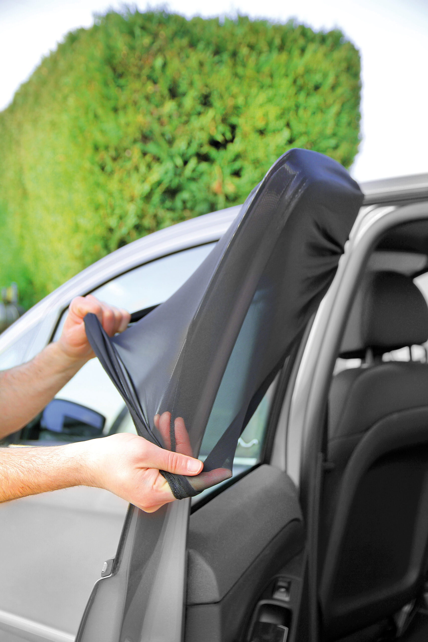 In 100% poliestere a doppio strato. Due funzioni: tendina parasole, per proteggere gli interni e i passeggeri dal sole, senza tuttavia bloccare la visibilità verso l’esterno; rete antinsetti, per non fare entrare gli insetti anche con i cristalli abbassati. Utilizzabile sui vetri laterali posteriori anche con vettura in movimento. Non intralcia la salita e la discesa del cristallo. Ripiegate su se stesse occupano poco spazio.