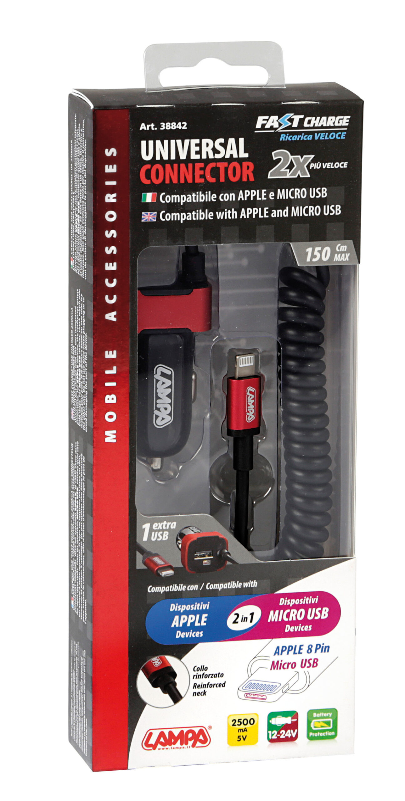 Caricabatteria Universal (Apple 8 pin / Micro Usb) con 1 porta Usb – Fast Charge – 2500 mA – 12/24V