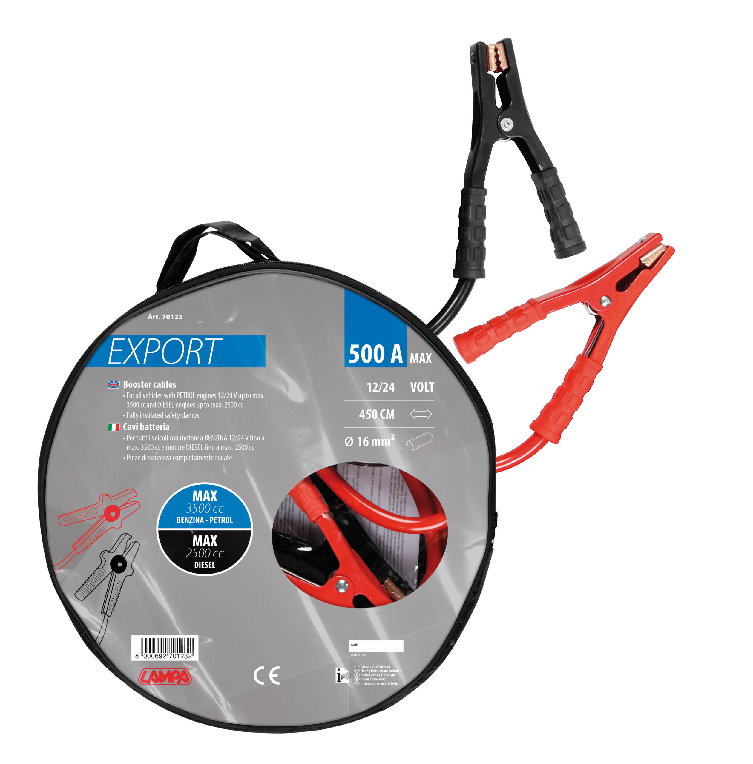 Con pinze di sicurezza isolate da 500 A. Molla delle pinze in acciaio temperato per una presa sicura sui poli batteria. Completi di pratica borsa/custodia