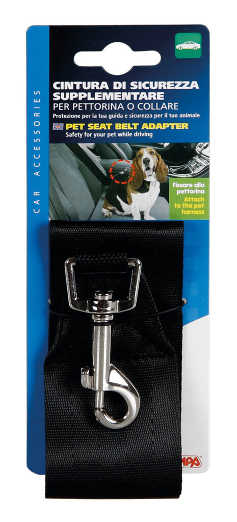 • Si aggancia facilmente alla cintura di sicurezza e alla pettorina del vostro animale.