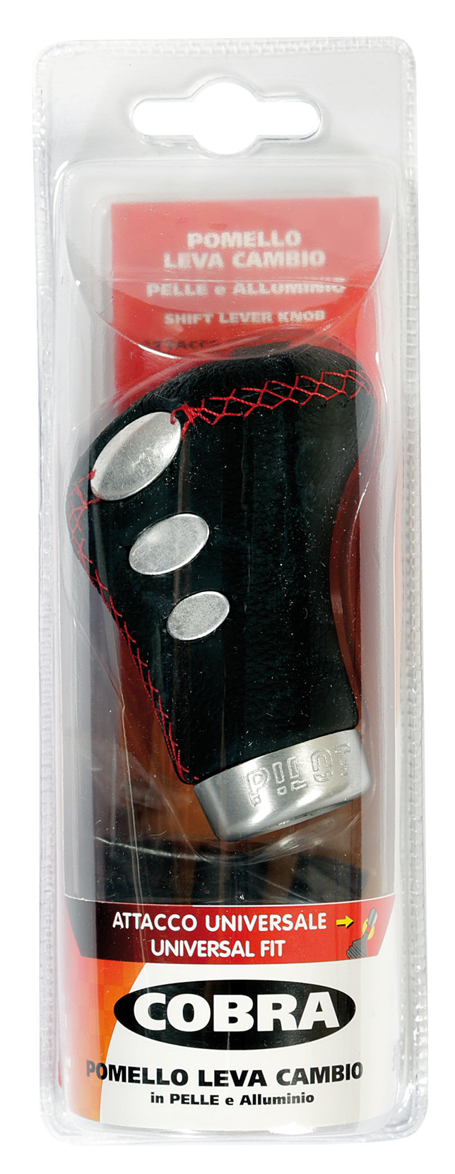 Pomello leva cambio in alluminio e pelle nera con cuciture colorate.