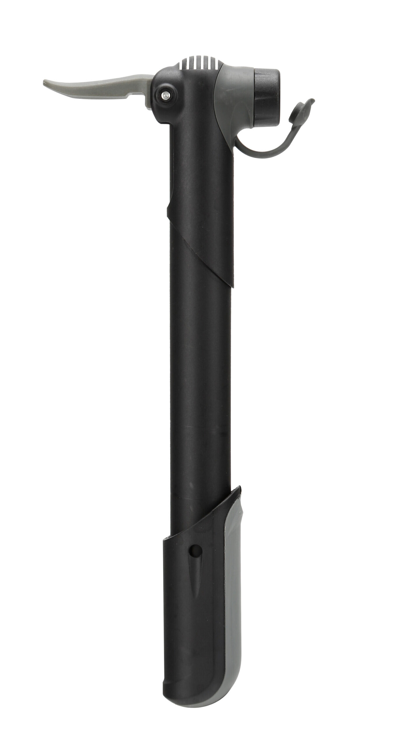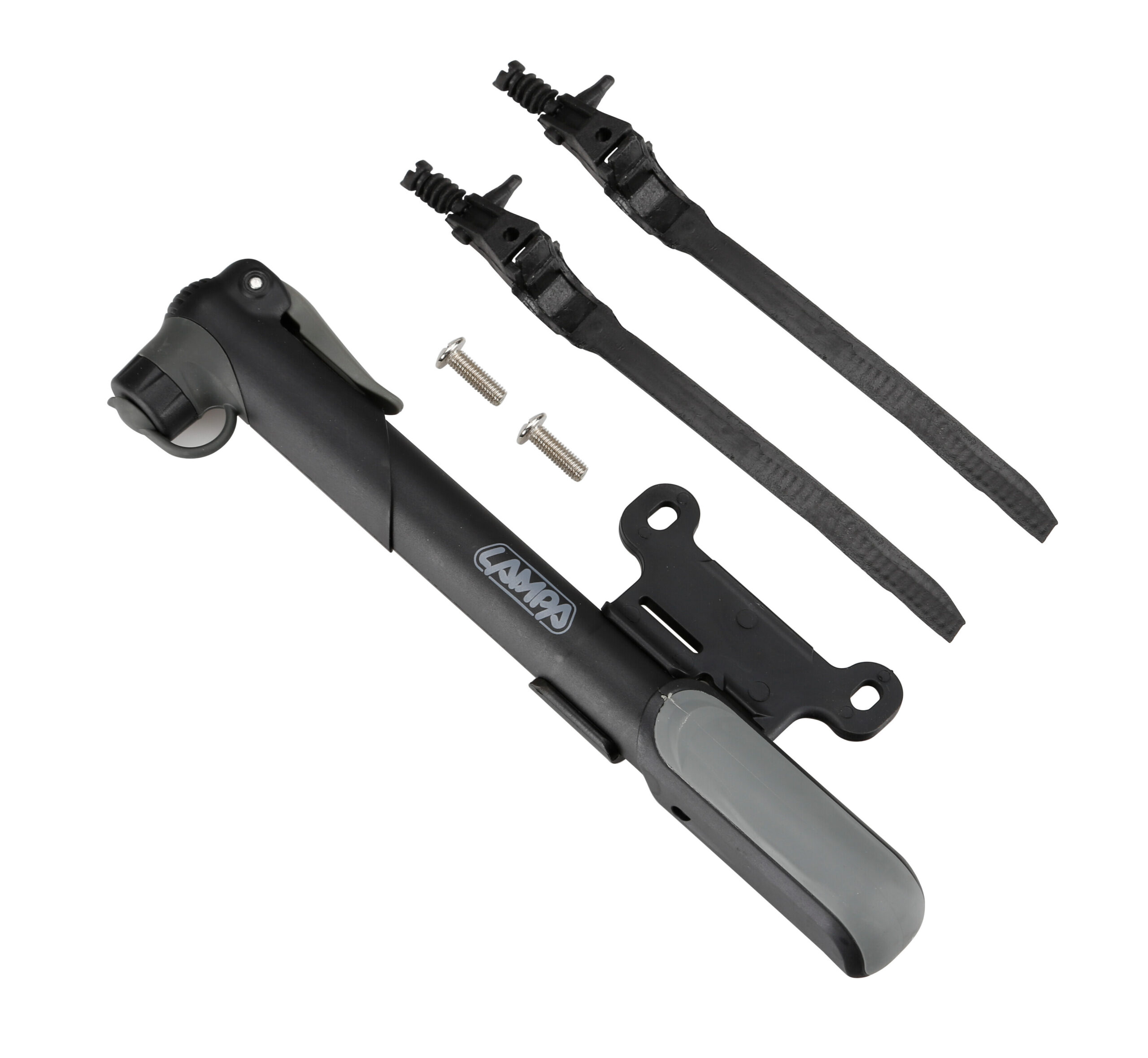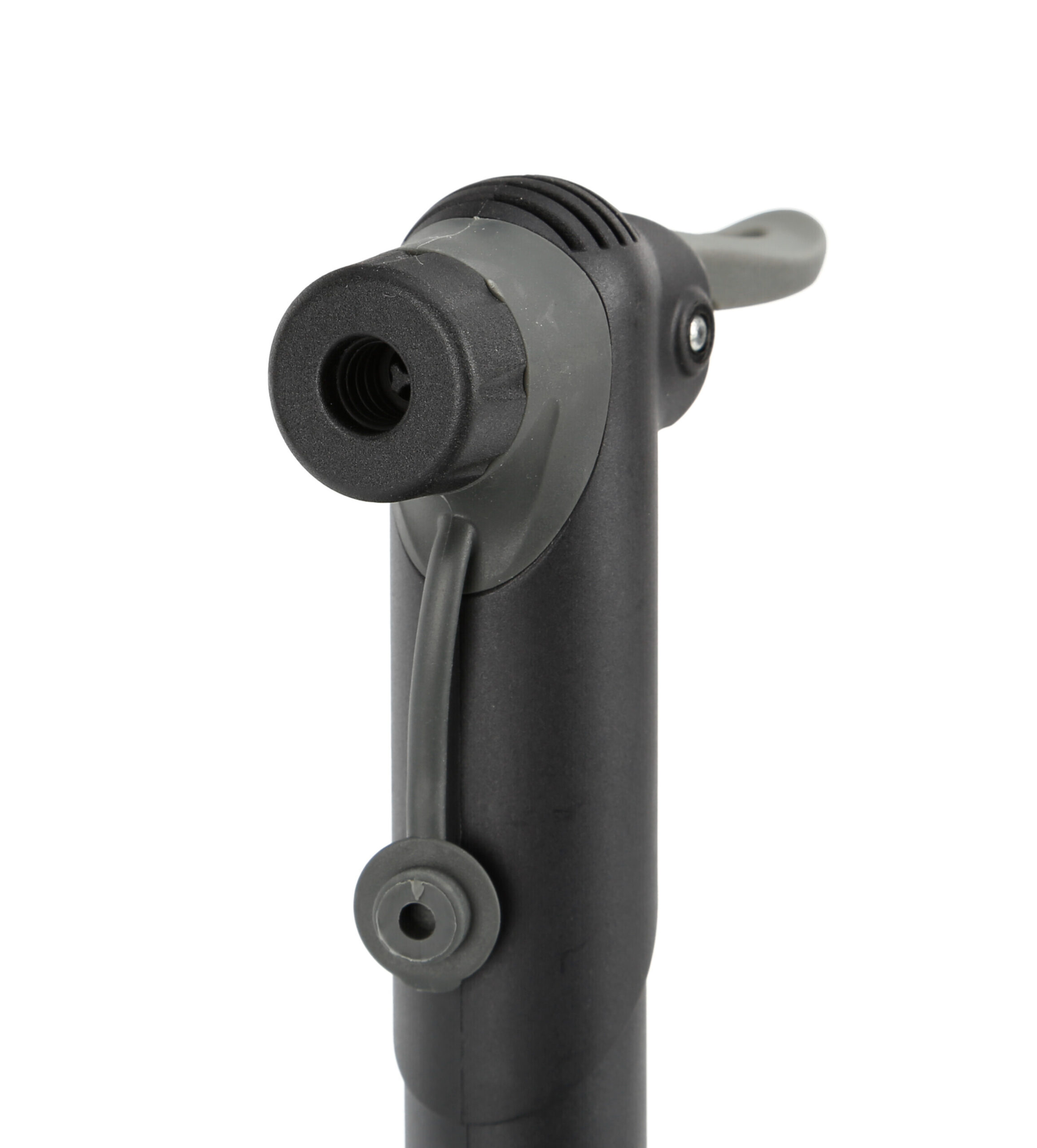 Compatta, leggera, con raccordo reversibile adatto per valvole Schrader, Presta (francese) e Regina (italiana). Con staffa di fissaggio.