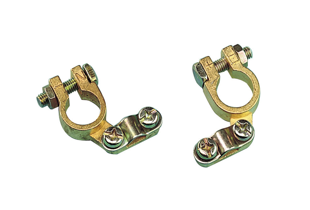 Morsetto batteria zincato; fissaggio cavo a capocorda su vite – foro capocorda Ø 6/6/6 mm – Polo negativo