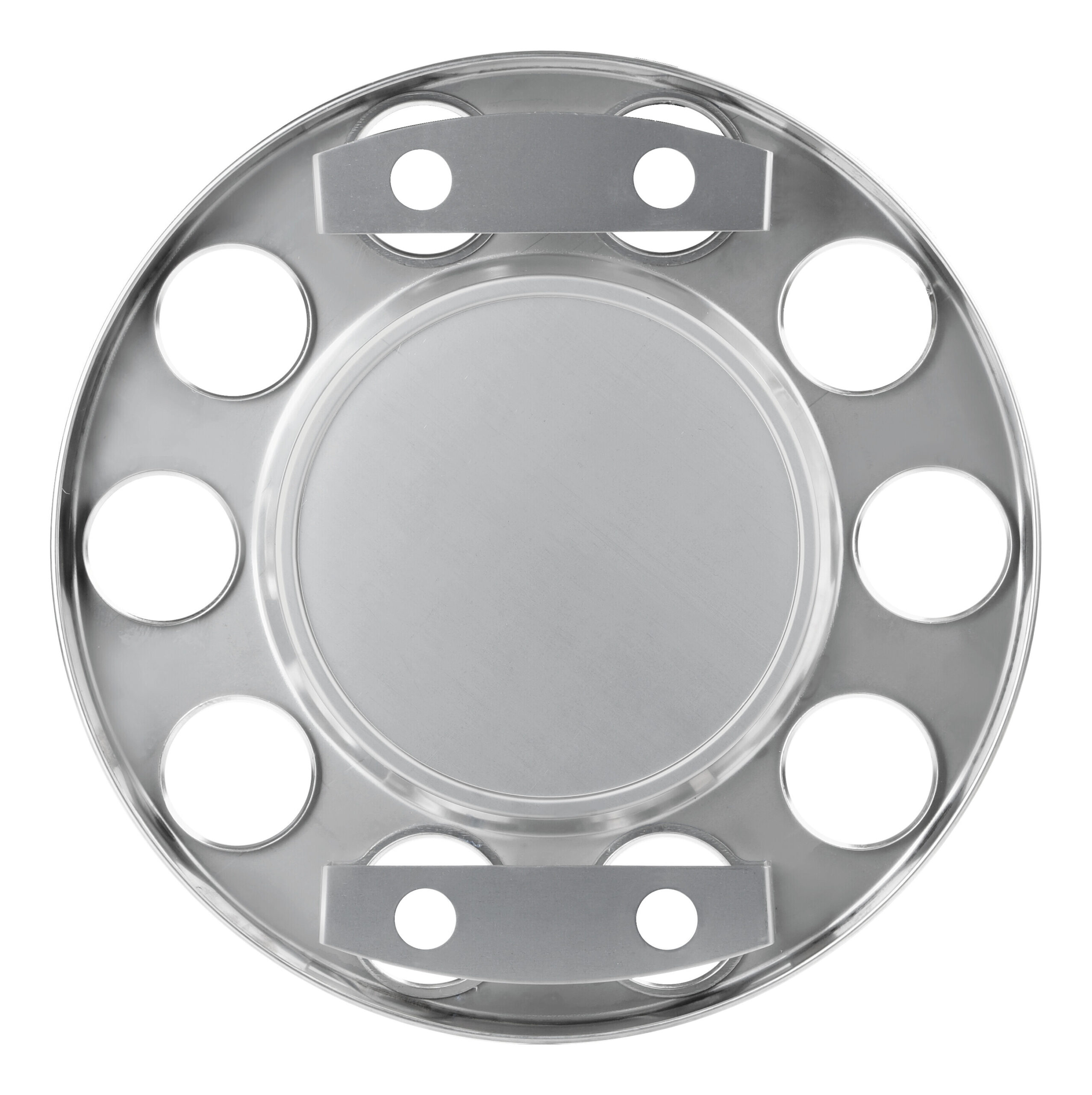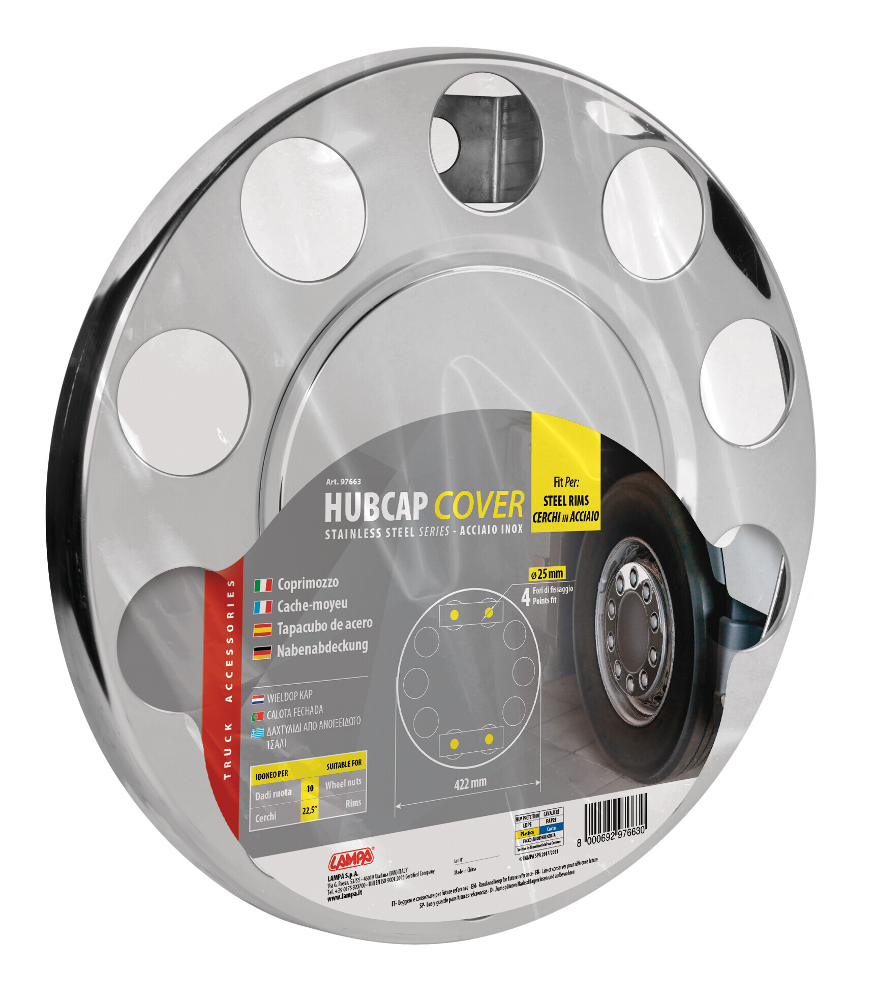 Realizzato in acciaio inox lucidato. Diametro cerchio 422 mm. Fori di fissaggio Ø 25 mm. 10 fori per bulloni.