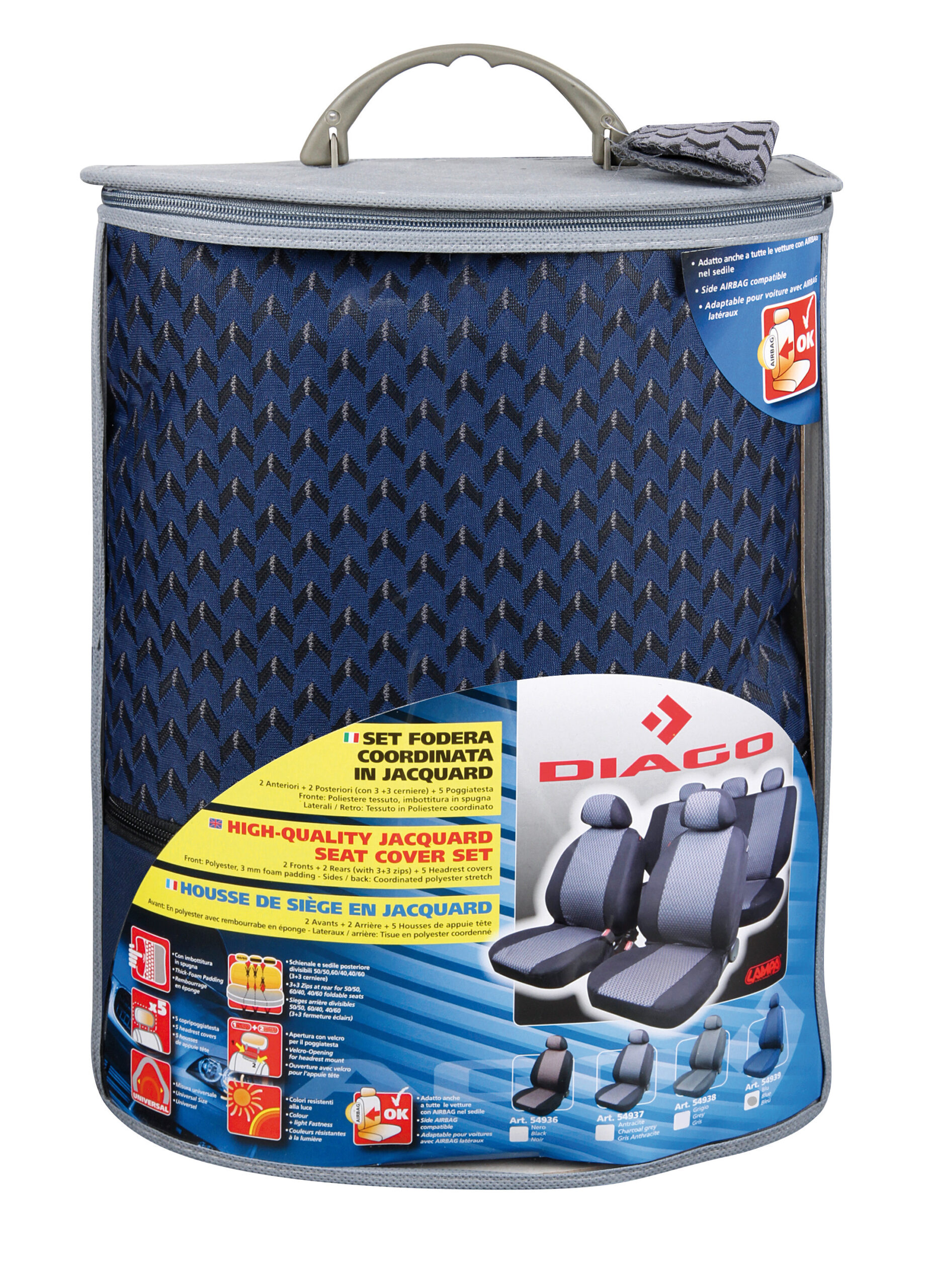 2 anteriori, 2 posteriori (con 3 +3 cerniere), 5 copripoggiatesta; universali per la maggior parte delle vetture con sedili standard, con e senza airbag laterali