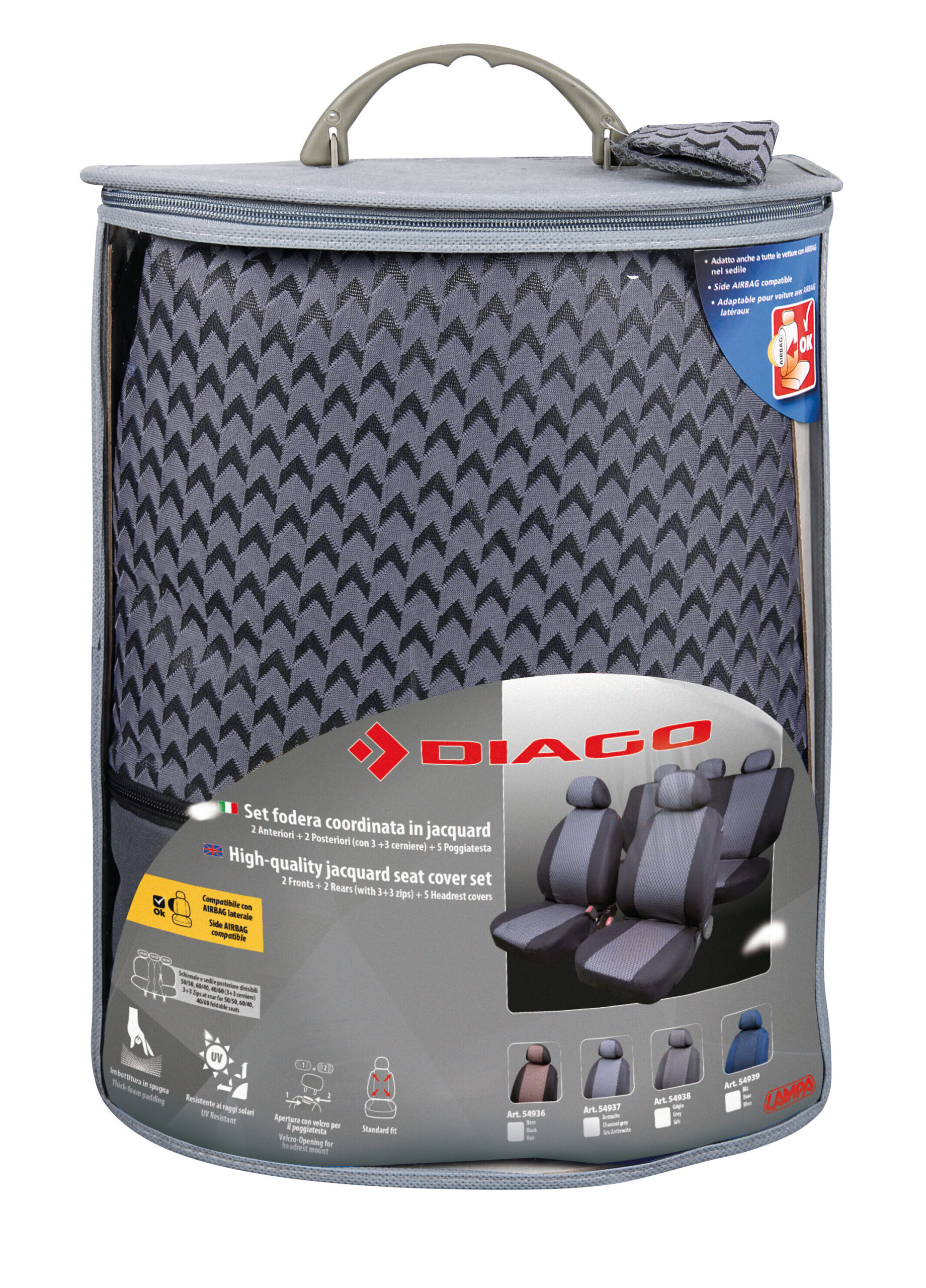 2 anteriori, 2 posteriori (con 3 +3 cerniere), 5 copripoggiatesta; universali per la maggior parte delle vetture con sedili standard, con e senza airbag laterali