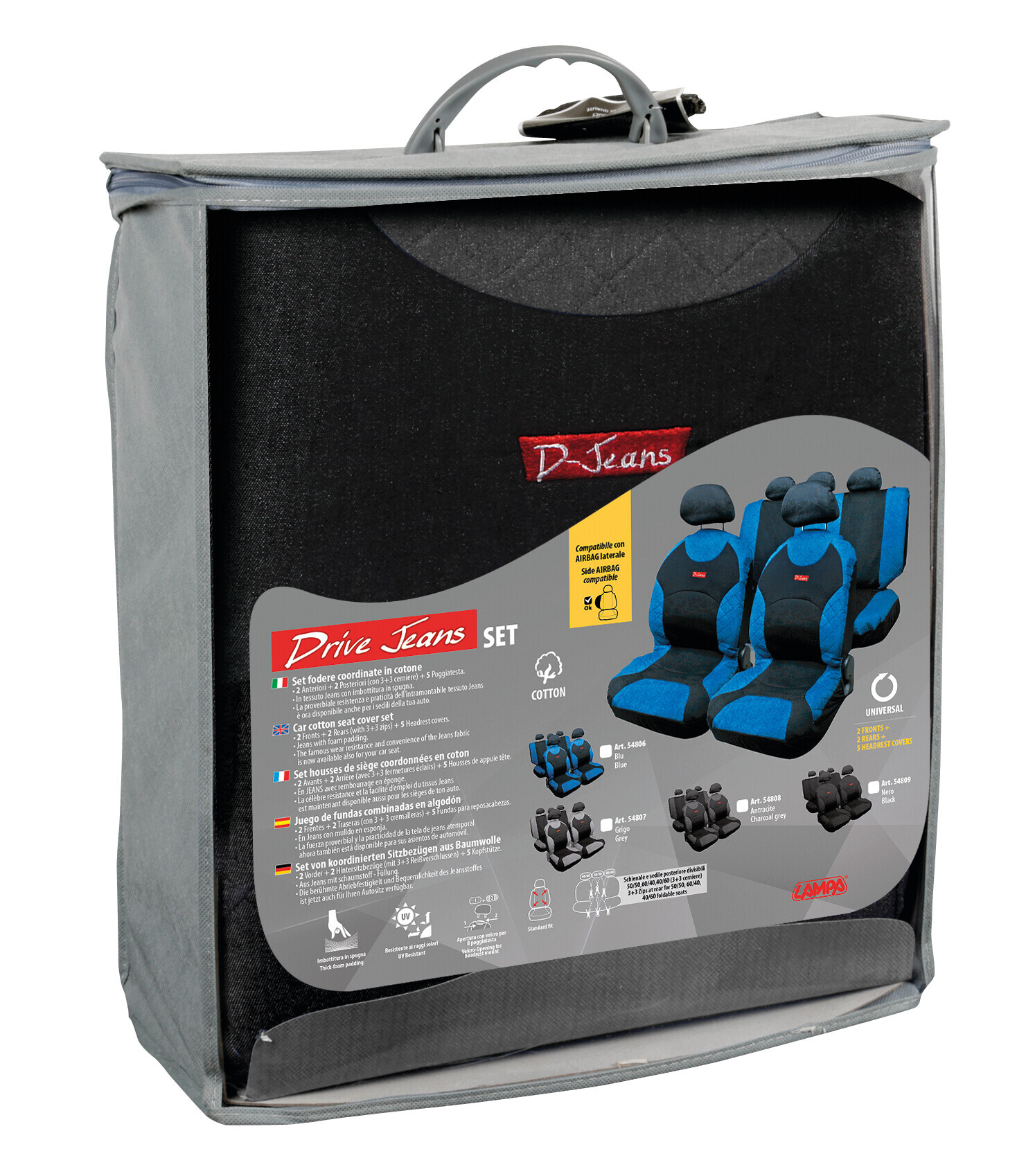 2 coprisedili anteriori, 2 coprisedili posteriori, 5 copri poggiatesta. In tessuto jeans con imbottitura in spugna