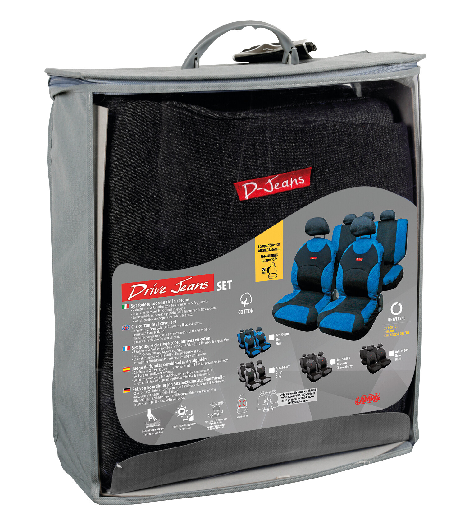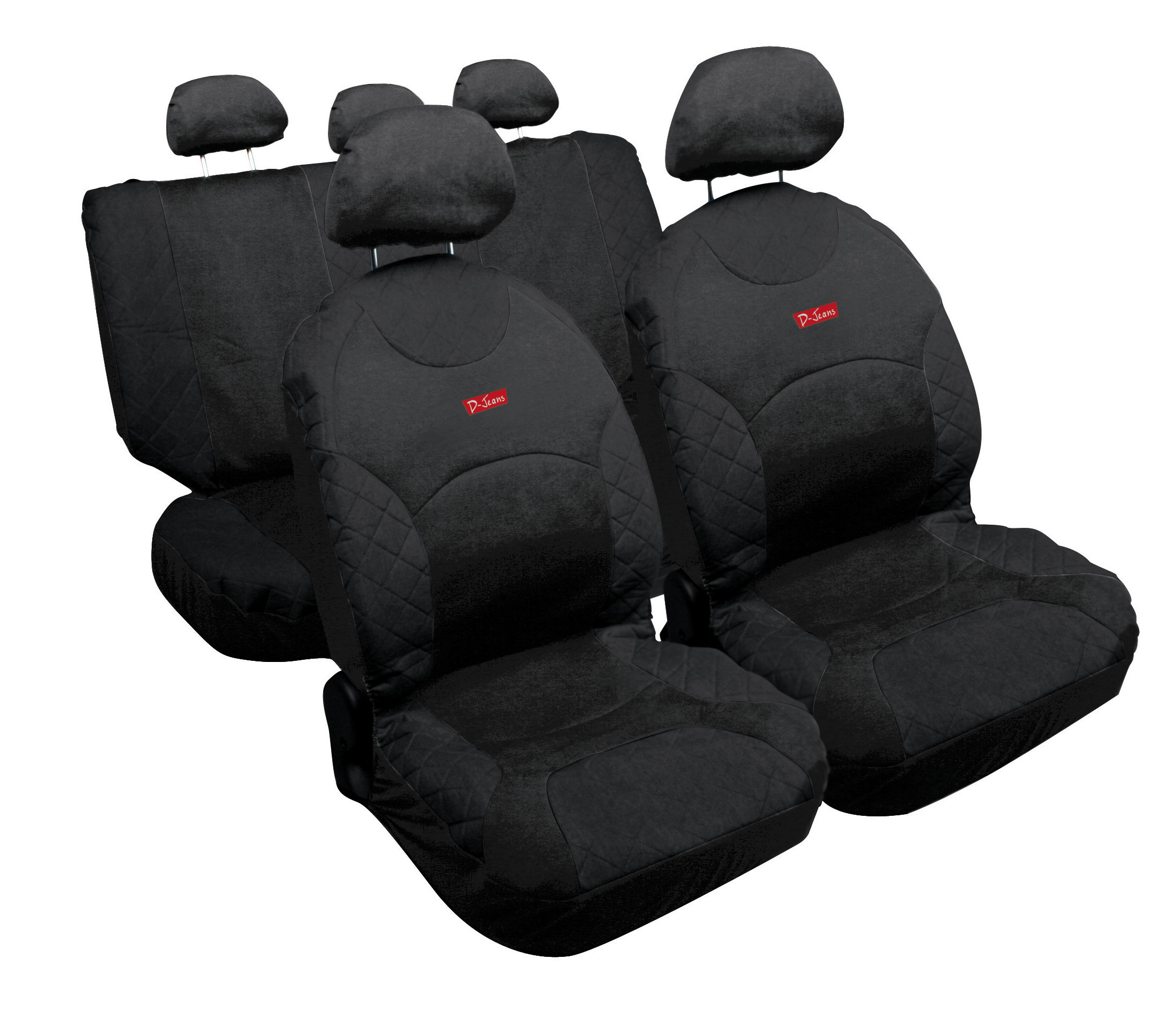 2 coprisedili anteriori, 2 coprisedili posteriori, 5 copri poggiatesta. In tessuto jeans con imbottitura in spugna