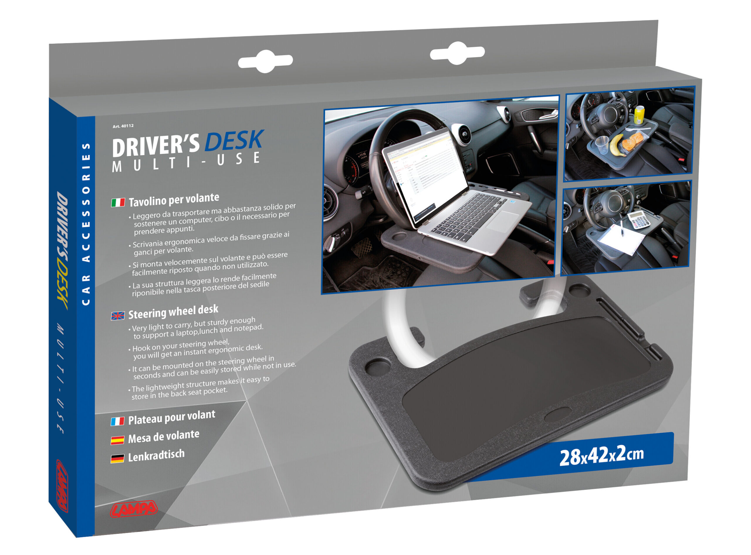 • Si fissa facilmente alla maggior parte dei volanti, fornendo una piano di appoggio, utile per lavorare, prendere appunti, per utilizzare computer portatili, tablet…