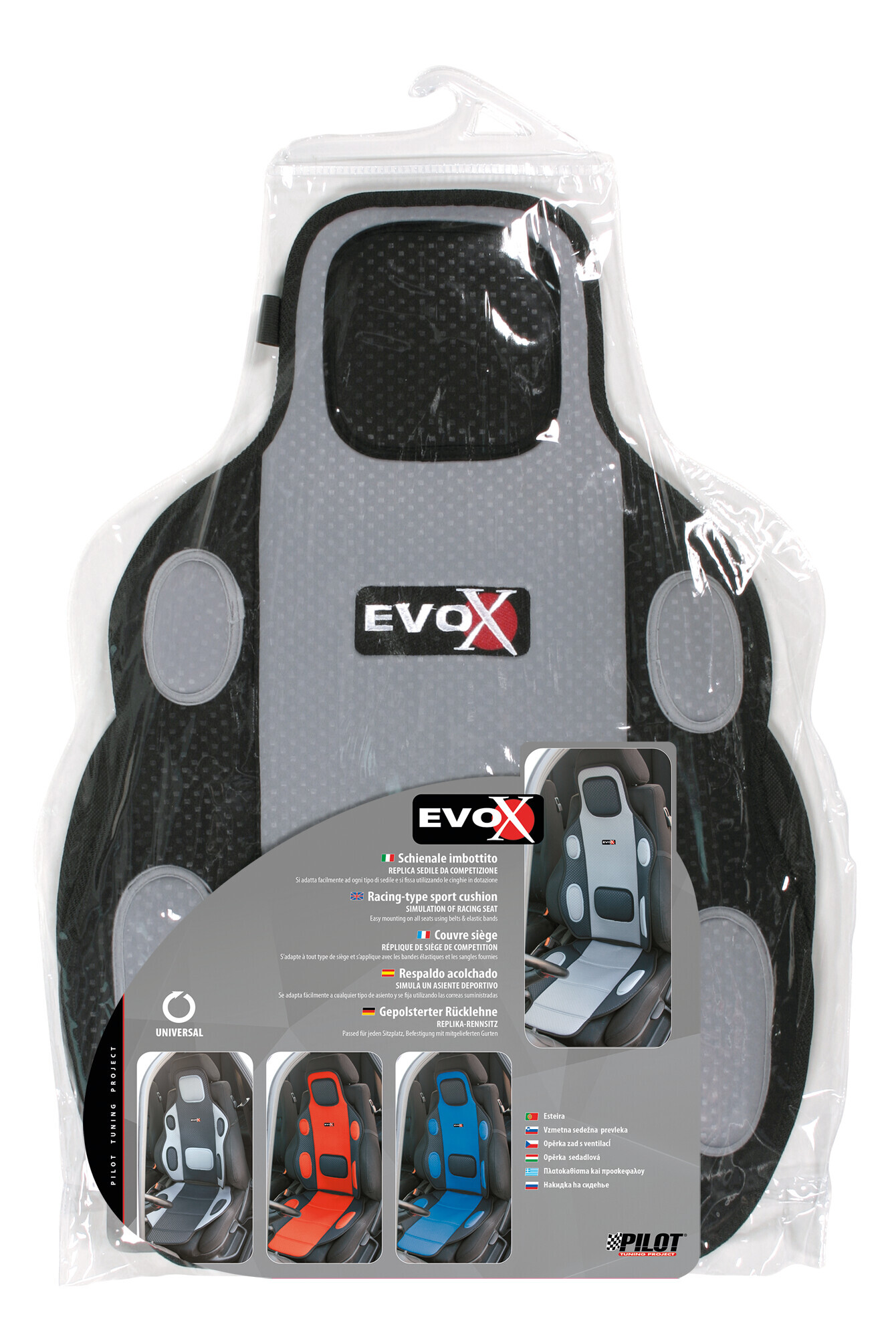 Replica sedile da competizione. Universale, si adatta facilmente ad ogni tipo di sedile e si fissa utilizzando le cinghie in dotazione