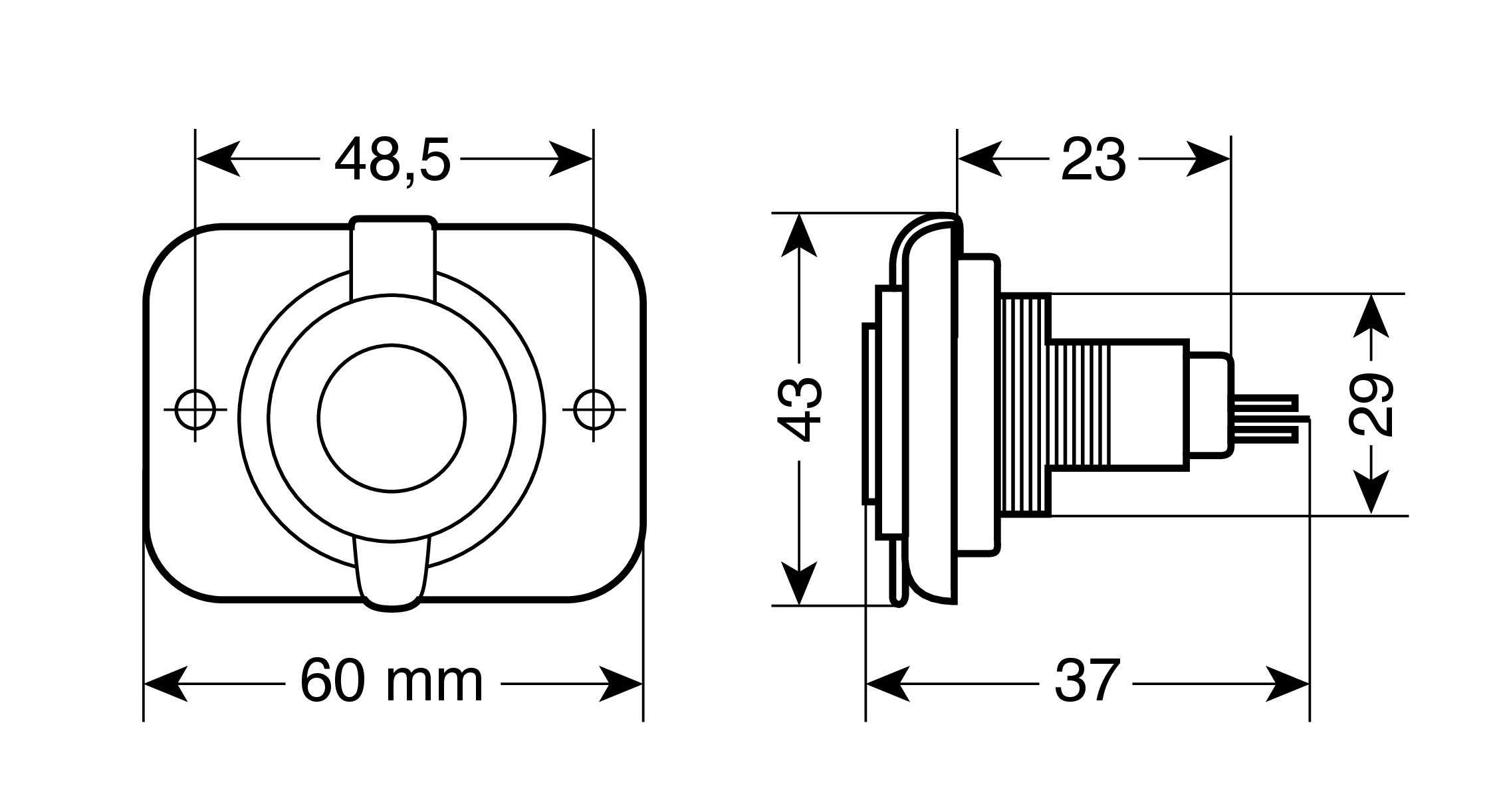 Per uso esterno o interno, con coperchio di chiusura. Per collegare apparecchiature 12 o 24V dotate di spinotto tipo DIN. Max 20A.