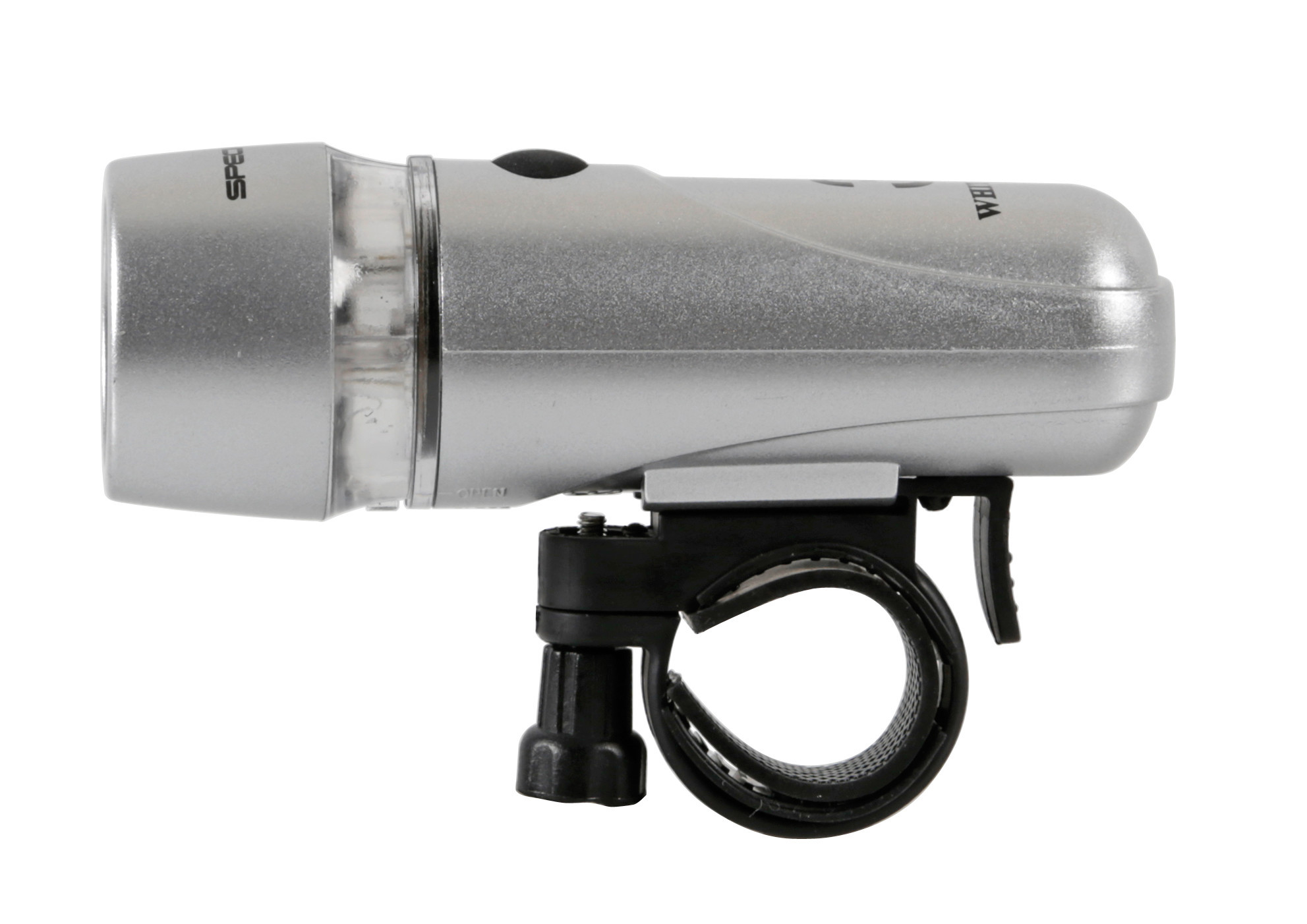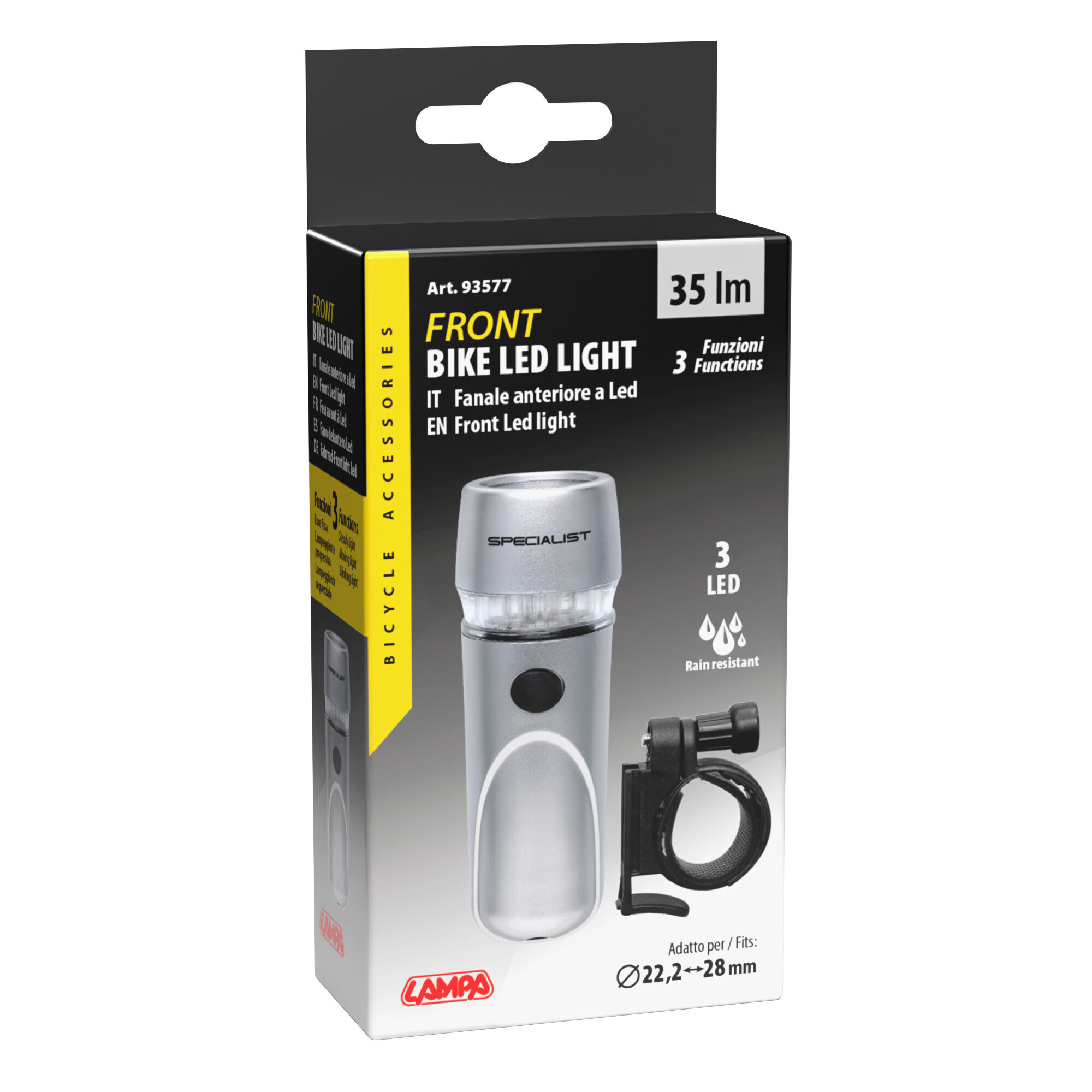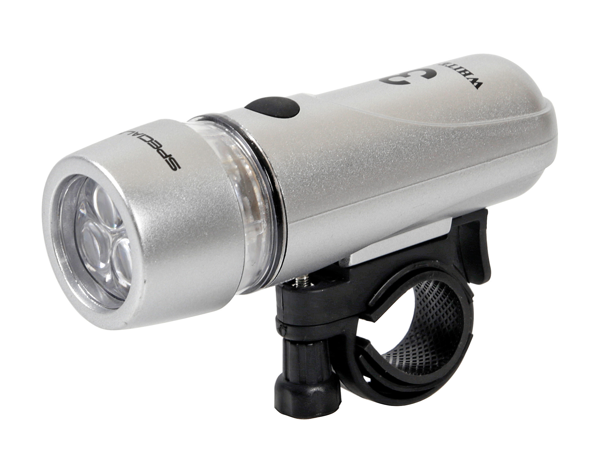 3 funzioni: luce fissa, lampeggiante, lampeggiante rapido. Staffa di fissaggio a innesto e disinnesto rapido. Funzionamento a batterie (non fornite)