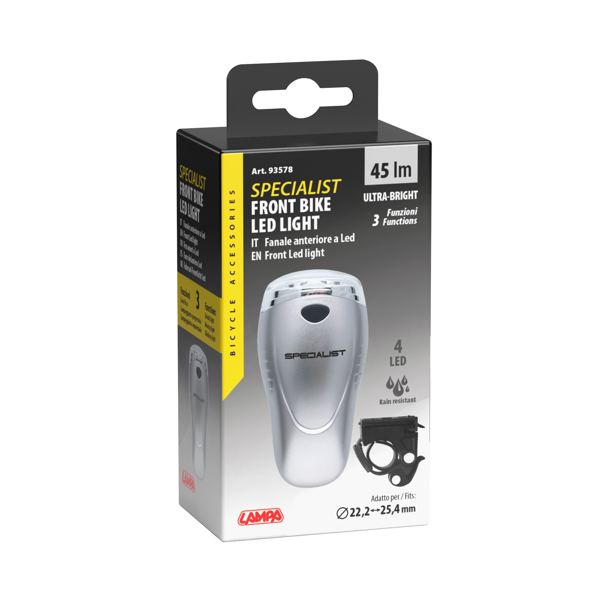 3 funzioni: luce fissa, lampeggiante, lampeggiante rapido. Staffa di fissaggio a innesto e disinnesto rapido. Funzionamento a batterie (4 AA non fornite)