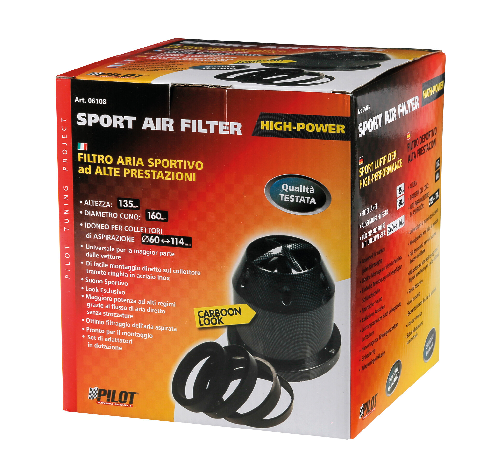 Montaggio diretto sul collettore tramite fascetta in acciaio inox e set di adattatori. Suono sportivo e look esclusivo. Maggiore potenza ad alti regimi grazie al flusso d’aria diretto senza strozzature. Ottimo filtraggio dell’aria aspirata. 2 anni di garanzia.