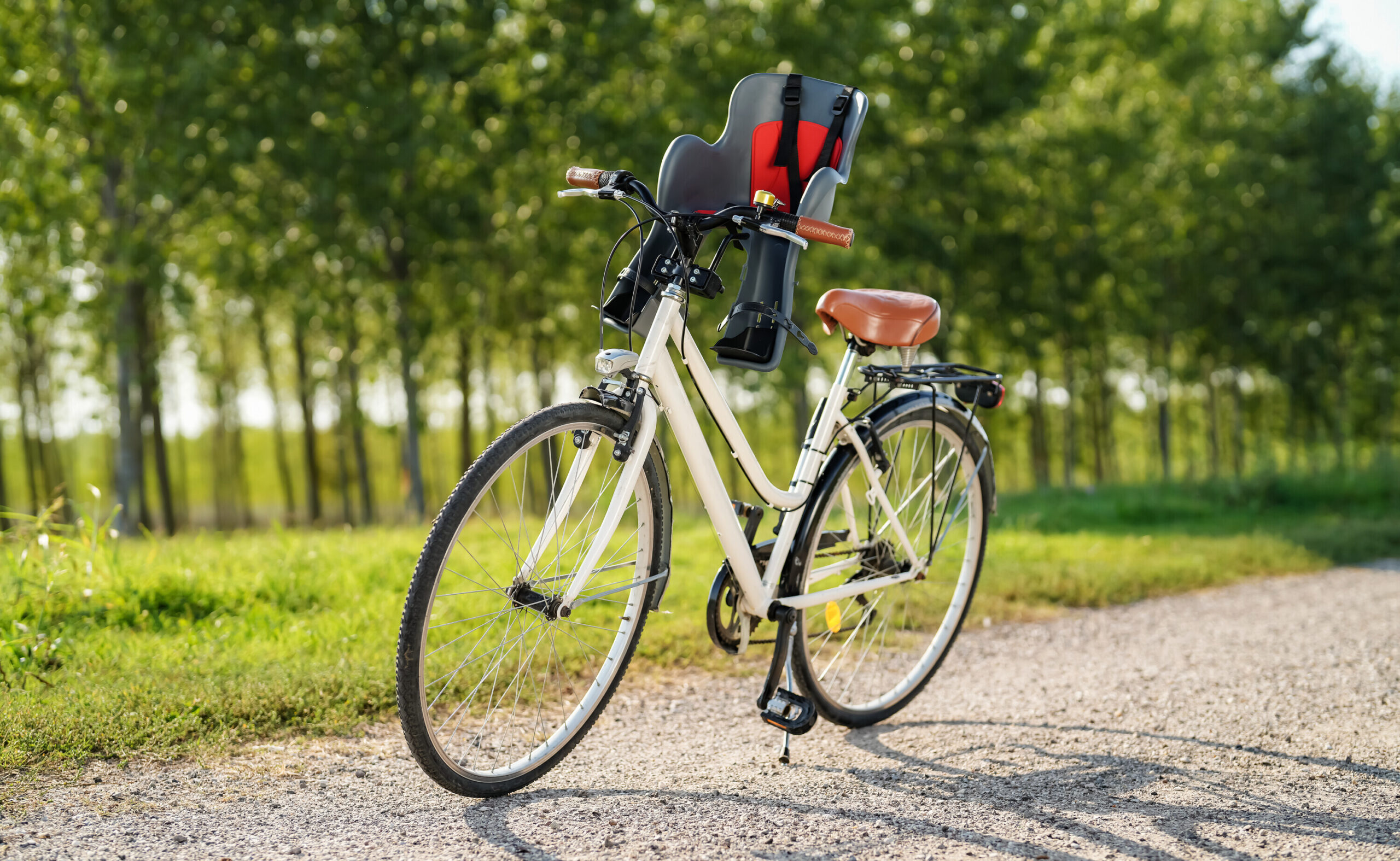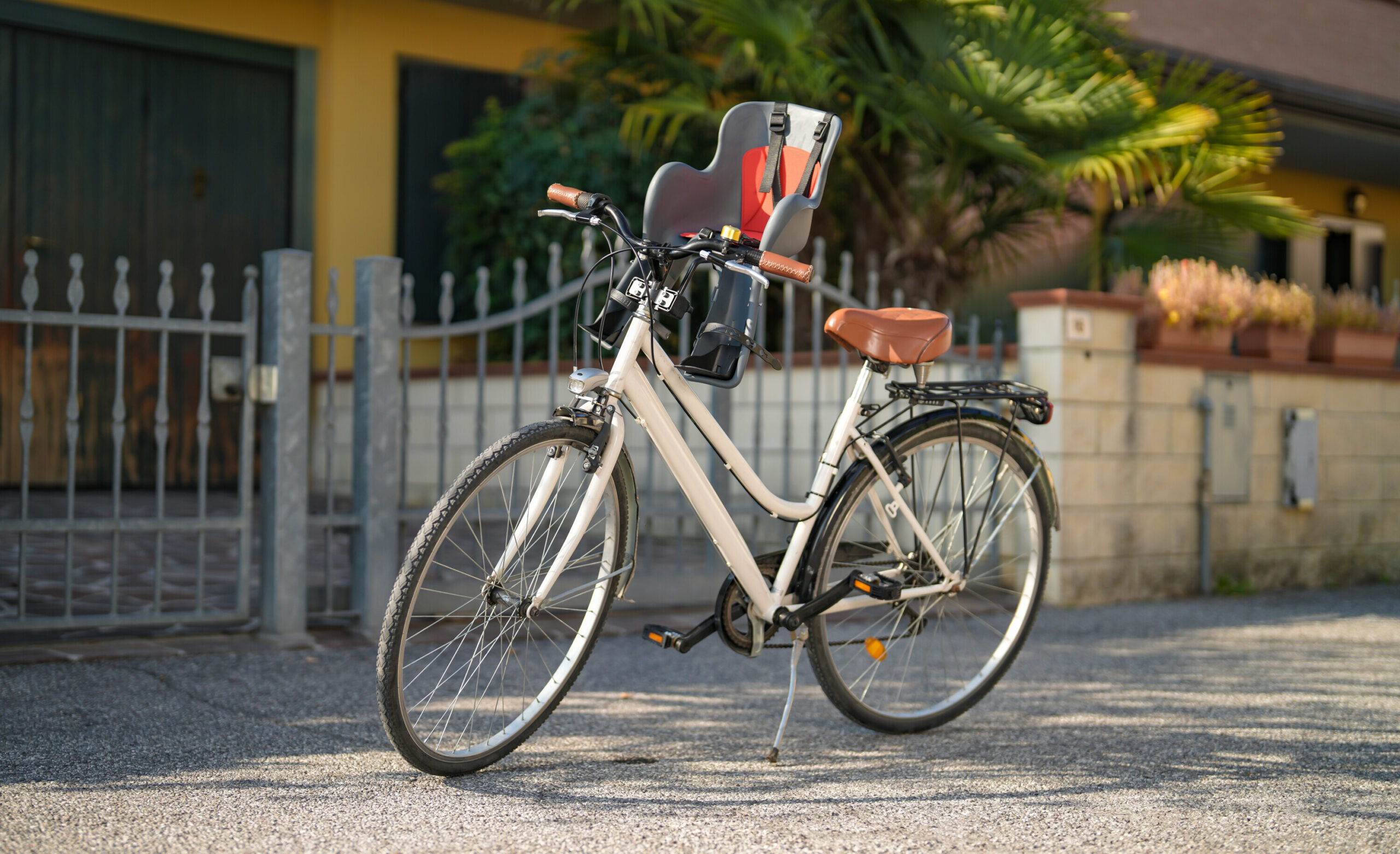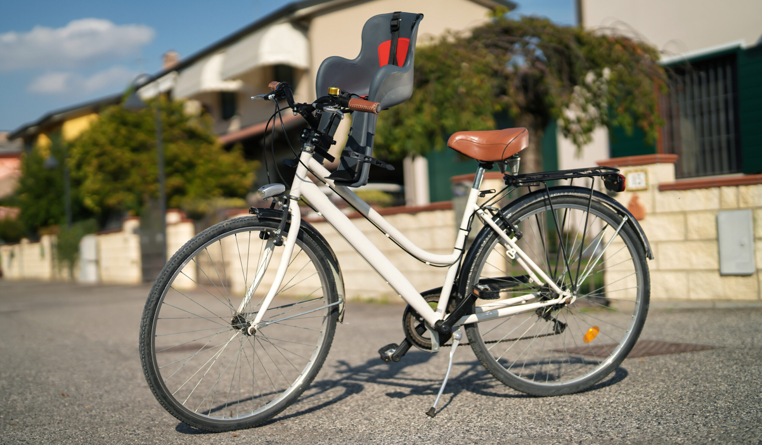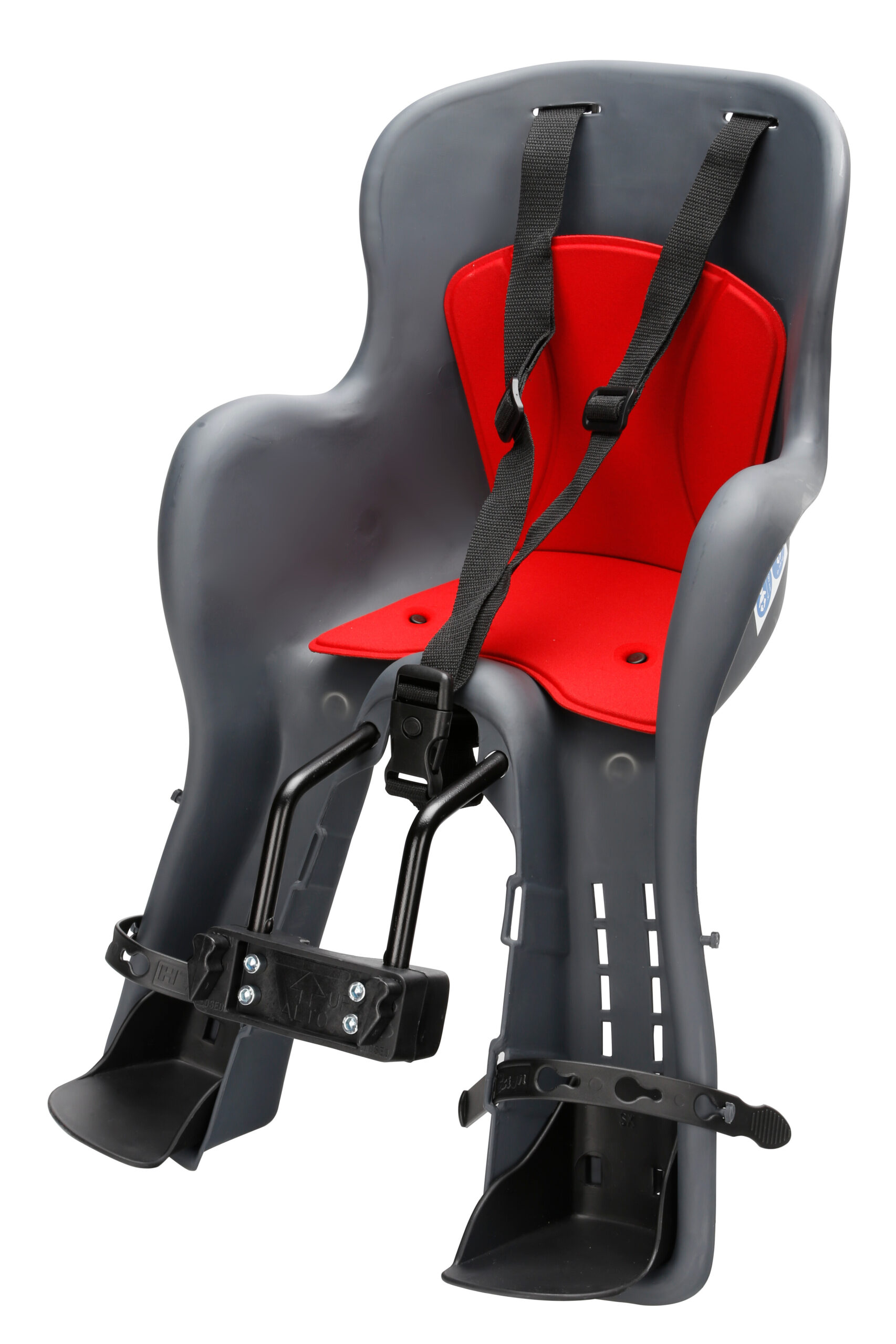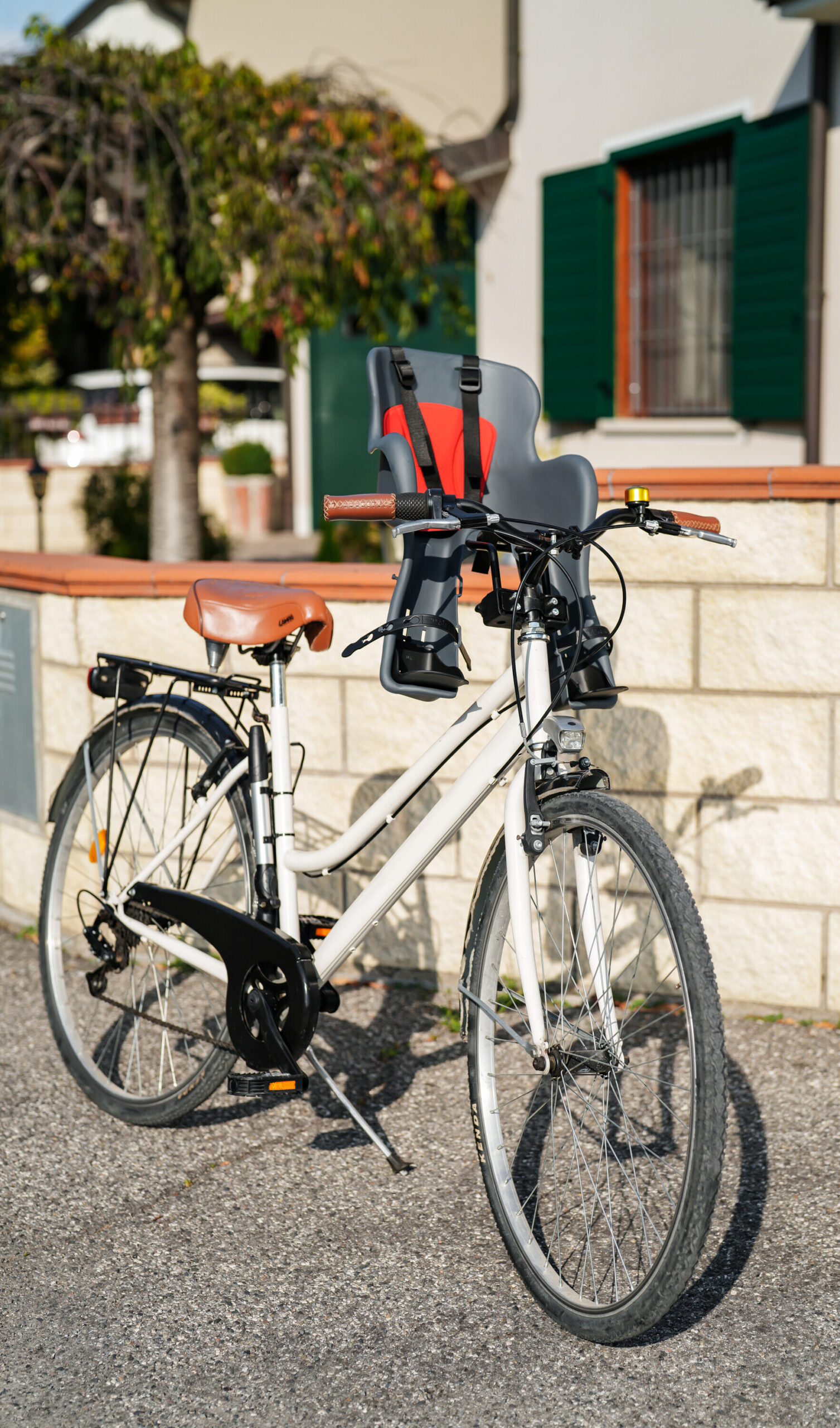 Poggiapiedi regolabili, cinture di sicurezza e cuscino lavabili. Per bici con piantone manubrio sia da 1” sia da 1”1/8, con ruote da 26” a 28”. Colori assortiti