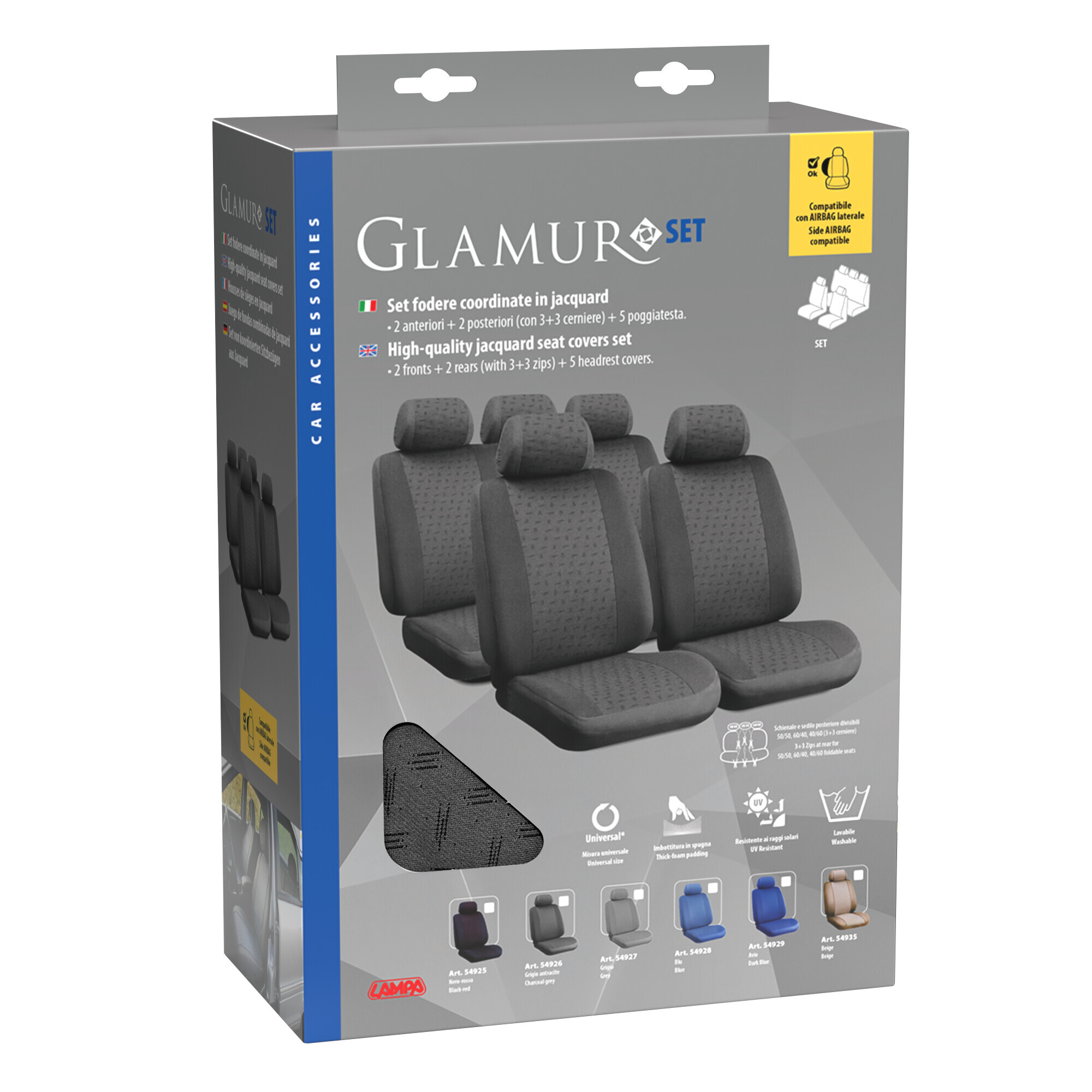2 anteriori, 2 posteriori (con 3+3 cerniere), 5 copripoggiatesta. Tessuto in poliestere e imbottiture in spugna