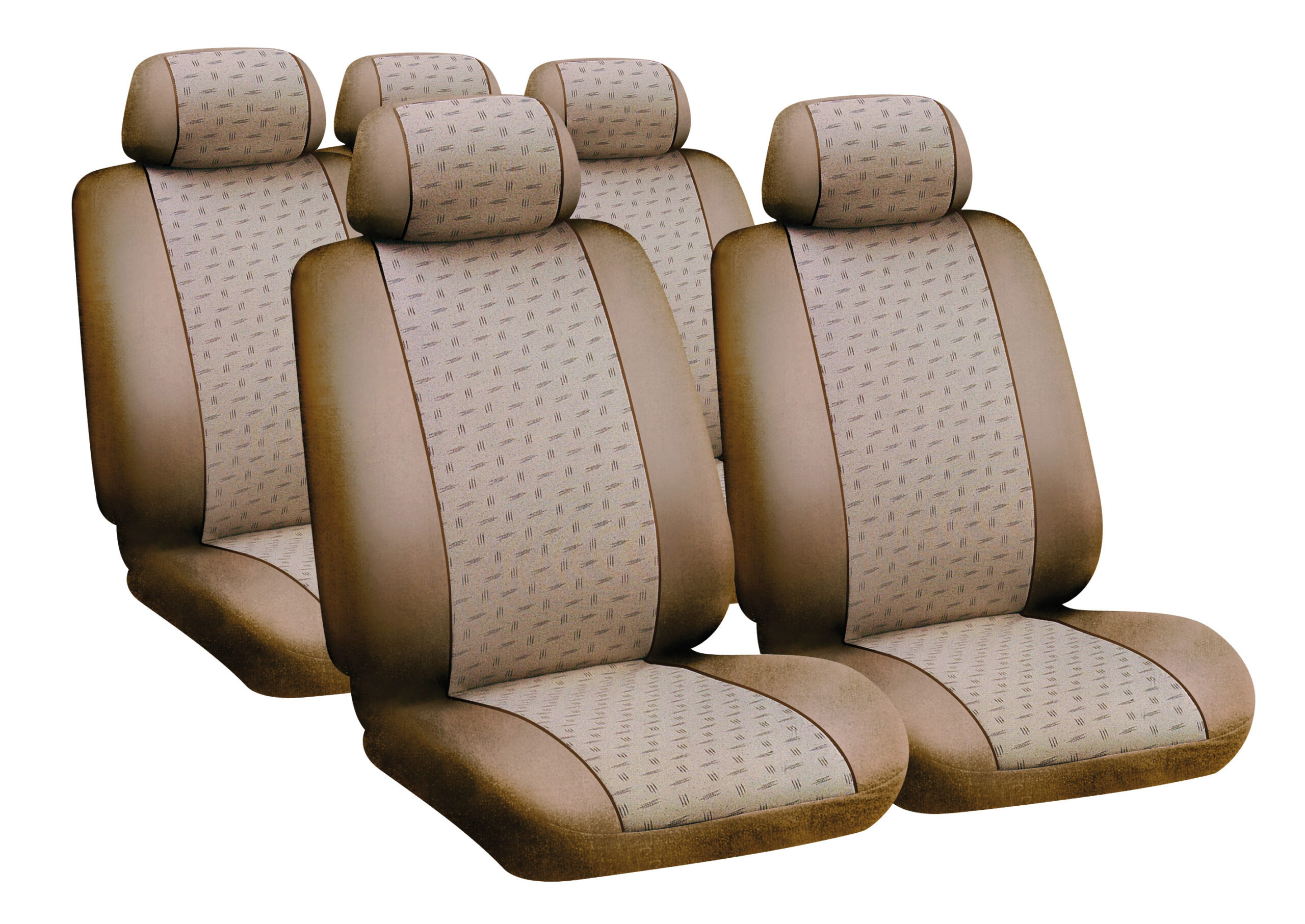 2 anteriori, 2 posteriori (con 3+3 cerniere), 5 copripoggiatesta. Tessuto in poliestere e imbottiture in spugna