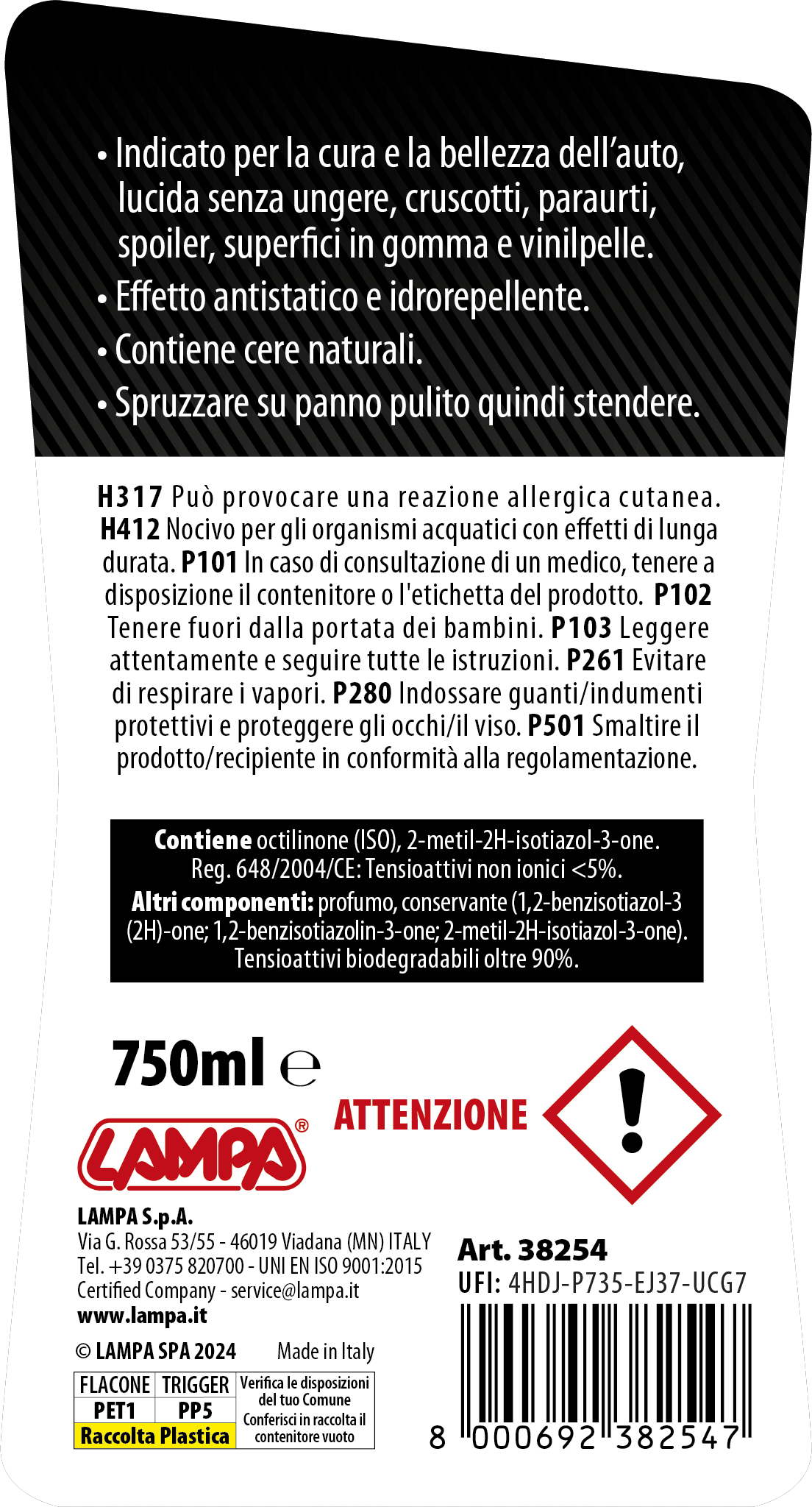• Lucida senza ungere, cruscotti, paraurti, spoiler, superfici in gomma e vinilpelle
